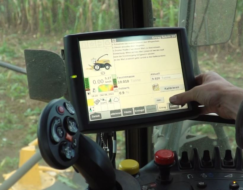 Das Kalibrieren erfolgt am besten zu Beginn der Ernte und bei Schlagwechsel oder zumindest wenn sich die Gräserzusammensetzung im Grünland stark ändert. Im Häckslerterminal wird der Vorgang per Knopfdruck gestartet, wenn eine neue Fuhre beladen wird. Ist die Fuhre voll, wird der Vorgang beendet. Anschließend wird die Fuhre am Betrieb oder auf der nächst gelegenen Waage gewogen. Dieses Nettogewicht muss der Häckslerfahrer nun im Terminal einspeichern. |