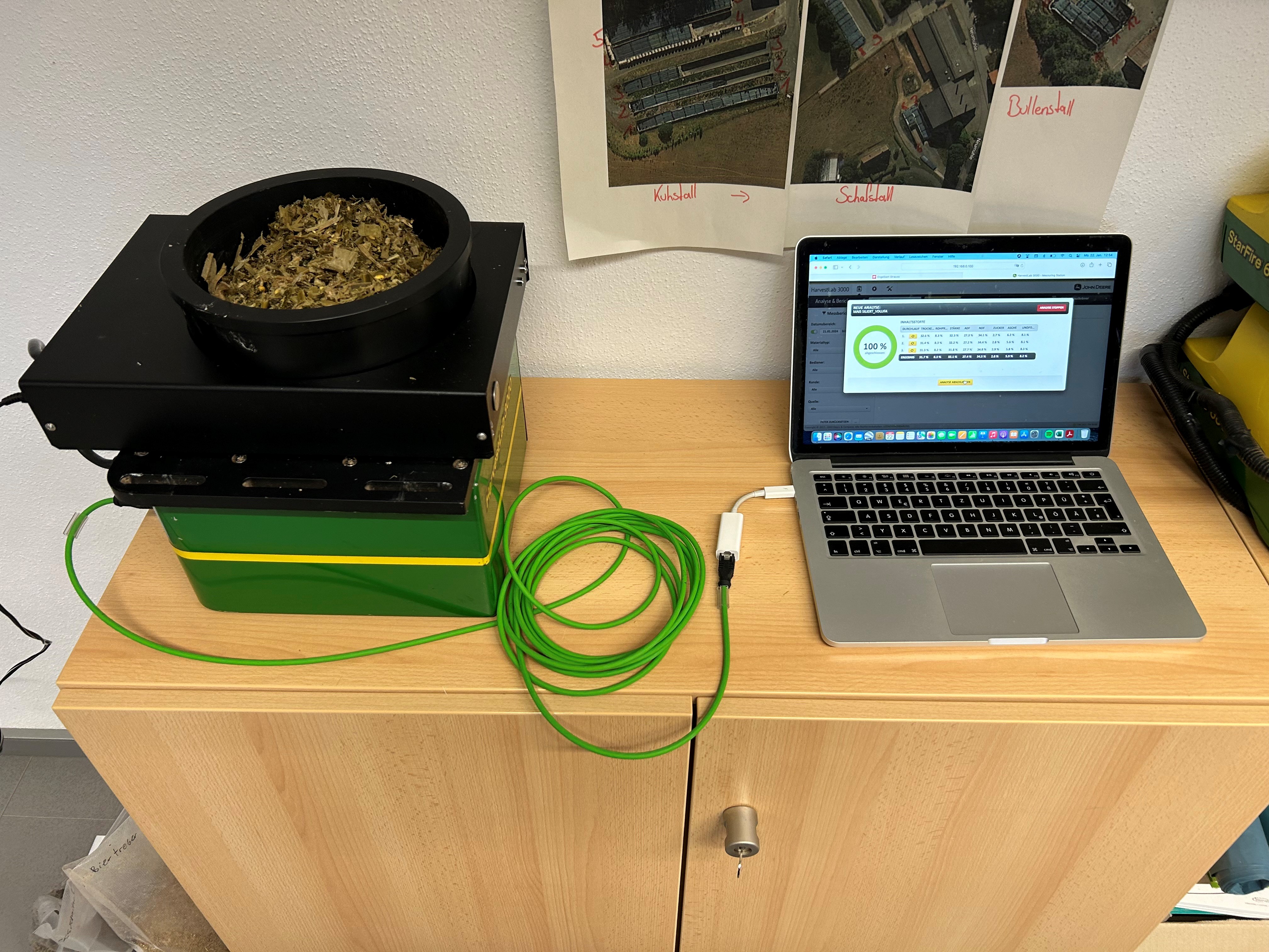 Sensordaten in der Landwirtschaft beziehen sich auf die Messwerte, die durch den Einsatz verschiedener Sensoren erfasst werden können, um landwirtschaftliche Prozesse, Umweltbedingungen oder den Zustand von Pflanzen, Tieren und Böden zu überwachen. Diese Daten können von unterschiedlichen Sensoren stammen, wie etwa Bodenfeuchtesensoren, Temperatursensoren, Kameras, Wetterstationen, GPS-Modulen oder Infrarotsensoren und dienen zur Optimierung landwirtschaftlicher Tätigkeiten. Die erfassten Daten können lokal gespeichert oder per Telemetrie in Echtzeit übertragen und verarbeitet werden. Zudem hat der Großteil der Landwirte keine genauen Informationen über die exakte Menge und die Qualität der Grundfuttermittel. Um dem entgegenzuwirken, können unterschiedliche Sensoren eingesetzt werden, die die Inhaltsstoffe der Futtermittel beispielsweise mit Nahinfrarotspektroskopie analysieren (Abb.1). Mit den dadurch gewonnenen Sensordaten können unter Anderem die Inhaltsstoffe des Erntegutes analysiert und dadurch die Rationen in der Fütterung besser angepasst werden.