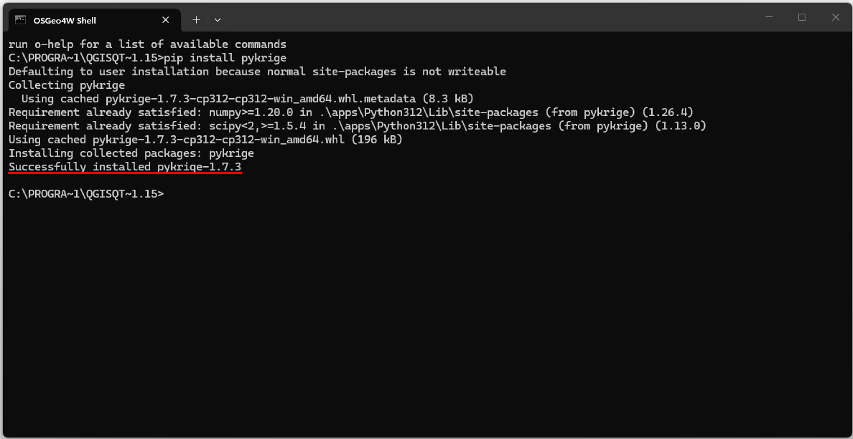 | Damit ist das Python-Paket in der QGIS-Python-Umgebung installiert und steht Ihnen in QGIS sowie den entsprechenden Plugins direkt zur Verfügung. | |