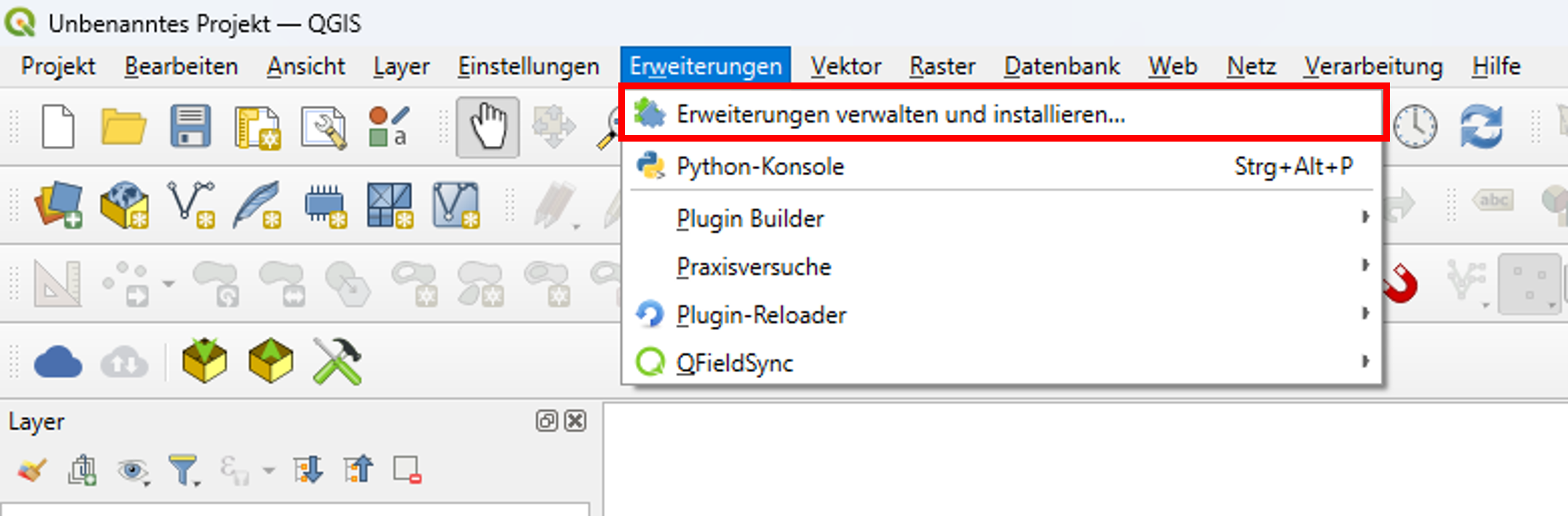 1. Starten Sie QGIS. 2. Klicken Sie in der Menüleiste auf Erweiterungen. 3. Wählen Sie Erweiterungen verwalten und installieren… aus. |