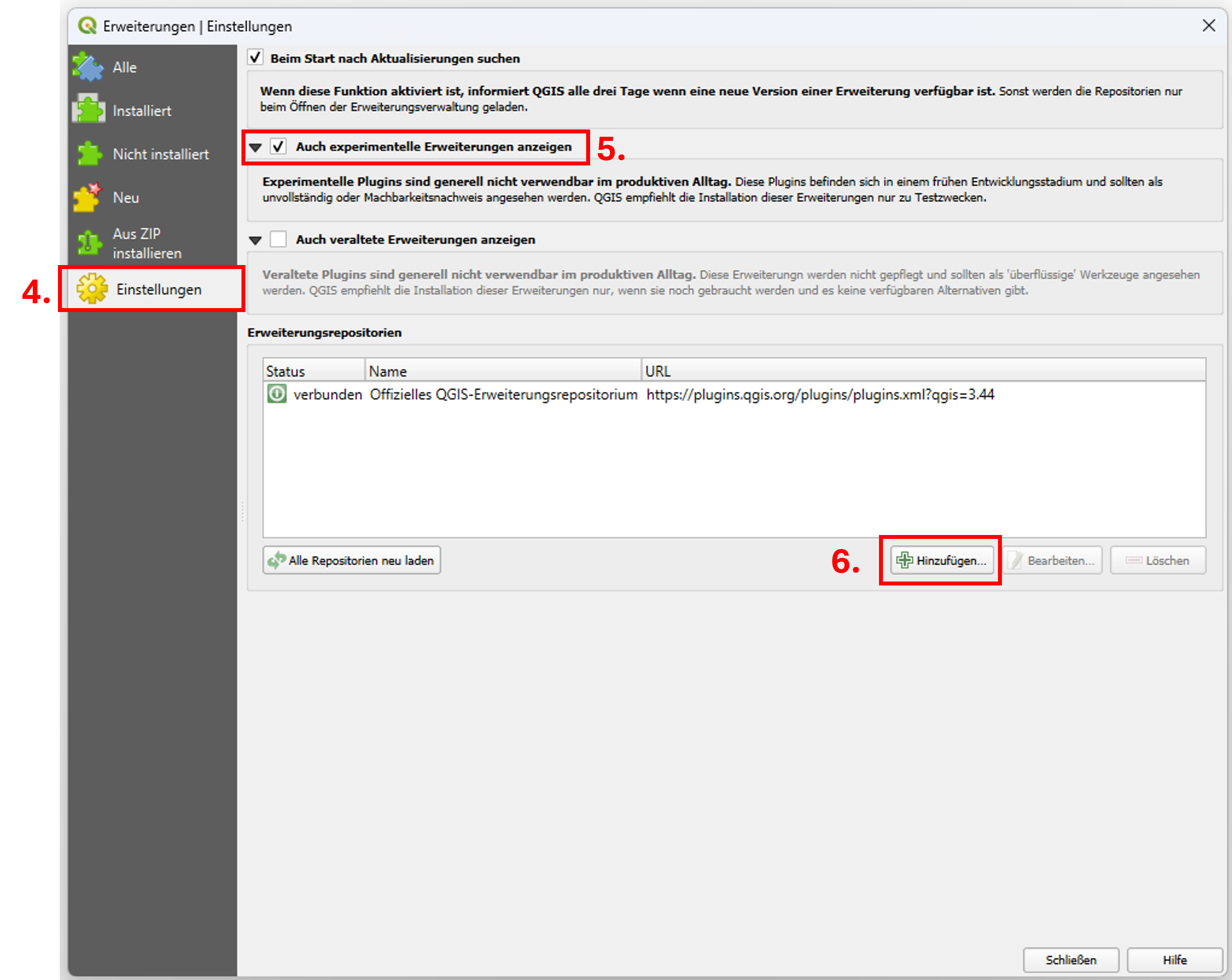 4. Navigieren Sie im geöffneten Fenster zum Reiter Einstellungen. 5. Stellen Sie sicher, dass Auch experimentelle Erweiterungen anzeigen aktiviert ist. 6. Klicken Sie im Bereich Erweiterungsrepositorien auf Hinzufügen. |