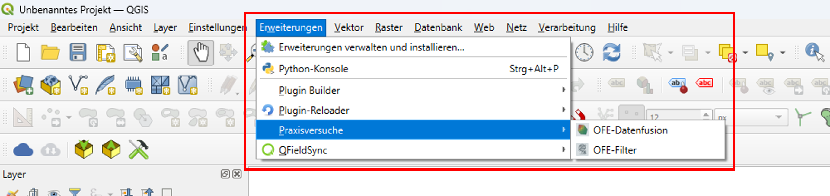 | Klicken Sie in der Menüleiste auf Erweiterungen. Nach erfolgreicher Installation erscheint dort die Kategorie „Praxisversuche“. Darunter finden Sie die Plugins OFE-Filter und OFE-Datenfusion. |