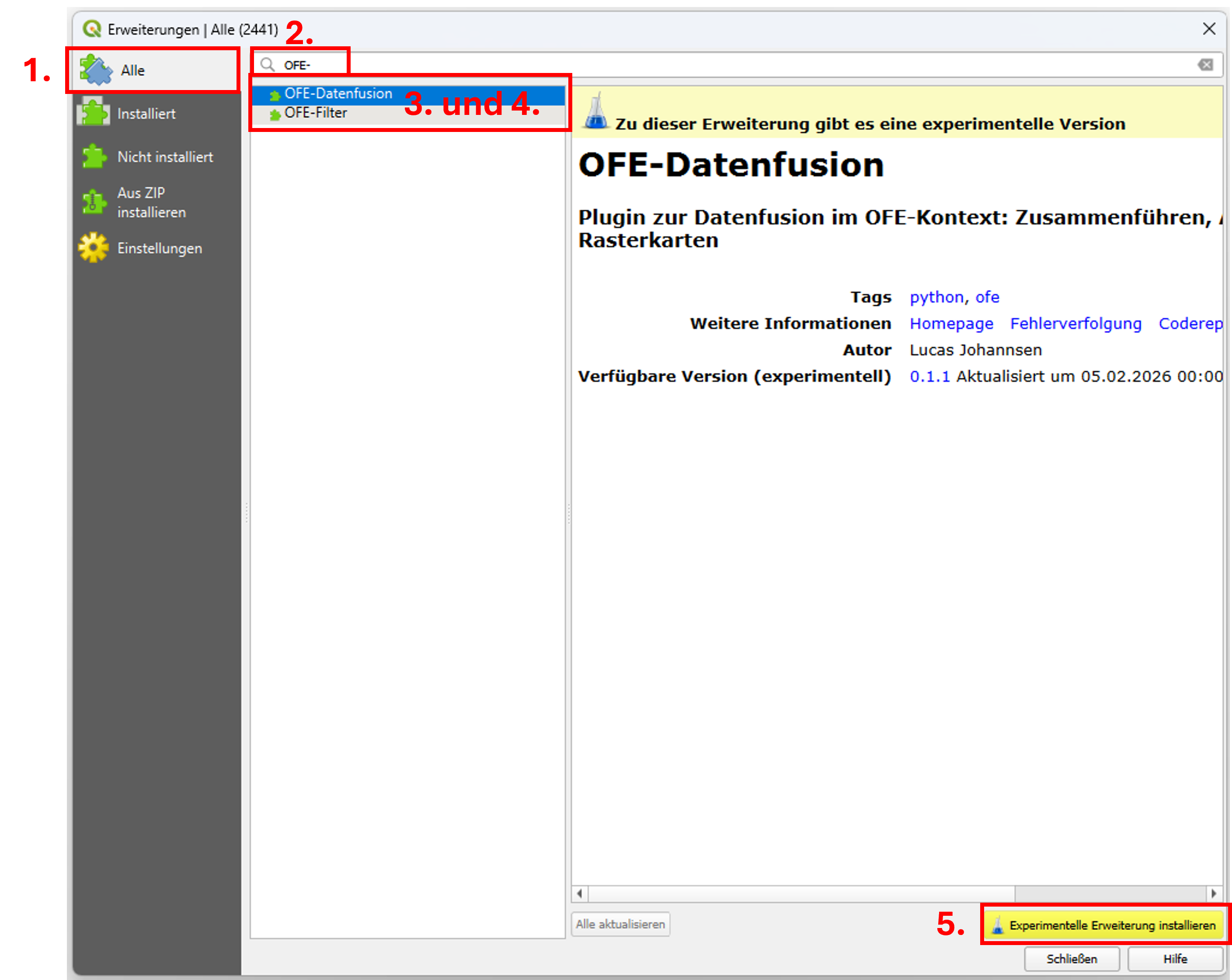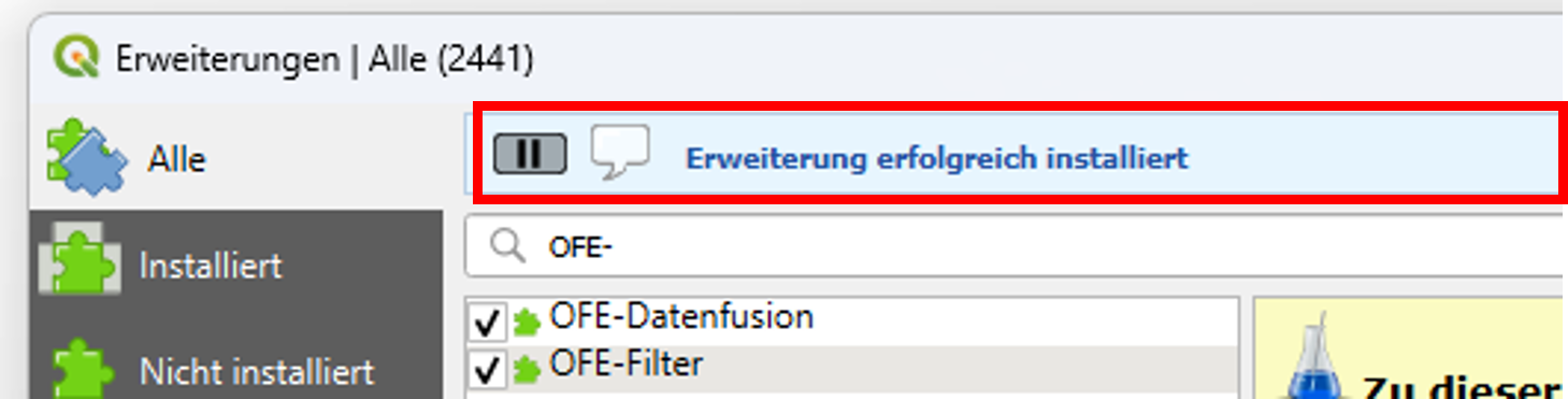 1. Navigieren Sie zum Reiter Alle. 2. Tragen Sie in die Suchzeile „OFE-“ ein. 3. Die Plugins OFE-Filter und OFE-Datenfusion werden aufgelistet. 4. Klicken Sie auf das erste Plugin, sodass es blau hinterlegt ist. 5. Klicken Sie auf Experimentelle Erweiterung installieren. Es erscheint die Statusmeldung: ![]() 6. Klicken Sie auf das zweite Plugin (wie Schritt 4). 7. Klicken Sie erneut auf Experimentelle Erweiterung installieren (wie Schritt 5). Es erscheint die Statusmeldung zur erfolgreichen Installation. Anschließend können Sie das Fenster schließen. |