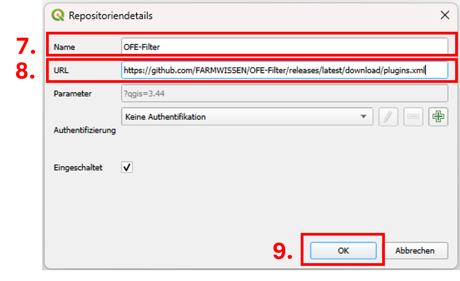 Hinzufügen des Erweiterungsrepositoriums des OFE-Filter Plugins: 7. Tragen Sie im geöffneten Fenster in der Zeile Name „OFE-Filter“ ein. 8. Kopieren Sie die folgende URL und fügen Sie sie in die Zeile URL ein: 9. Bestätigen Sie mit OK. |