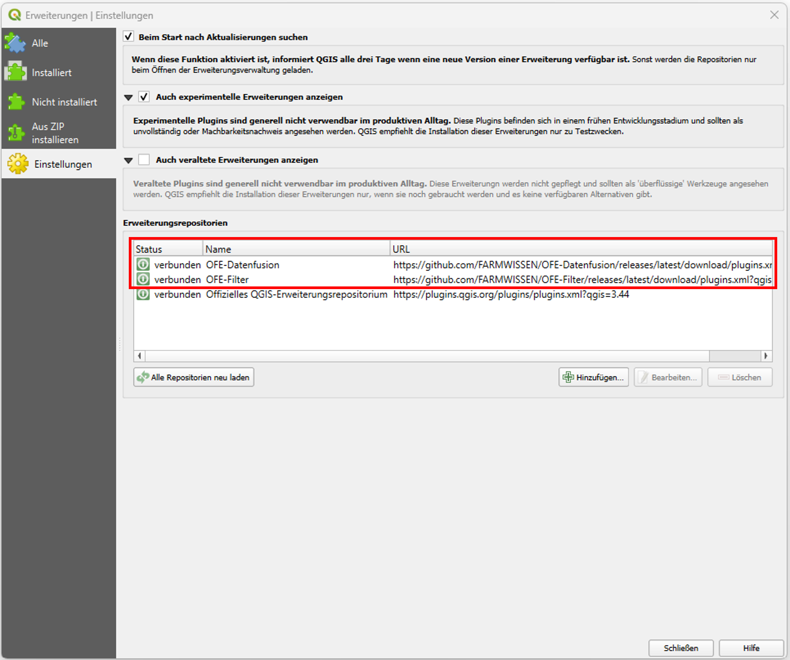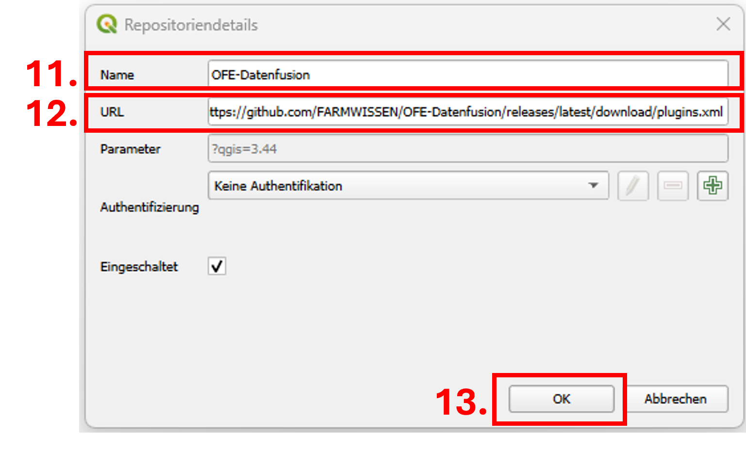 Hinzufügen des Erweiterungsrepositoriums des OFE-Datenfusion Plugins: 10. Klicken Sie im Bereich Erweiterungsrepositorien erneut auf Hinzufügen (Schritt 6). 11. Tragen Sie im geöffneten Fenster in der Zeile Name „OFE-Datenfusion“ ein. 12. Kopieren Sie die folgende URL und fügen Sie sie in die Zeile URL ein: 13. Bestätigen Sie mit OK. |