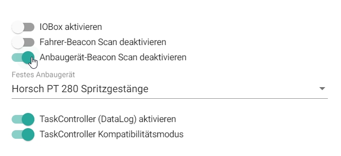 | Sollten Sie eine selbstfahrende Feldspritze besitzen, ist es sinnvoll, dem Selbstfahrer ein festes Anbaugerät zuzuweisen. Navigieren Sie hierfür über die Menüleiste links und wählen Sie Anbaugeräte. Fügen Sie (wie in Einrichtung beschrieben) das Spritzgestänge als Anbaugerät hinzu. Navigieren Sie in der Menüleiste links zu Fahrzeuge. Neben dem Selbstfahrer sehen Sie 3 Punkte, klicken Sie darauf und dann auf bearbeiten (Stiftsymbol). Scrollen Sie in dem Fenster nach unten. Am Ende des Fensters erscheinen Schieberegler: Aktivieren Sie "Anbaugerät-Beacon Scan deaktivieren" und wählen Sie dann in der aufklappenden Zeile das Spritzgestänge aus der Liste aus. Speichern Sie ihre Auswahl und schließen Sie alles. Ein weiterer Fall wäre ein Traktor, der ausschließlich vor dem Futtermischwagen läuft. |