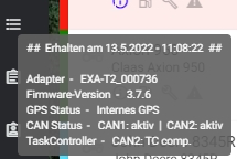 | Führen Sie wie gewohnt ihre Arbeiten auf den Feldern aus. Das System schreibt während der Fahrt alle verfügbaren Daten (u. a. die Aufwandmengen) automatisch mit. Sie brauchen nichts weiter zutun. Zur Kontrolle können Sie in der App verfolgen, ob der Traktor sich bewegt. Nach einiger Zeit erscheint in der Statusanzeige ein blaues Ausrufezeichen. Navigieren Sie mit der Maus darüber, um zu sehen, ob der Taskcontroller aktiv ist. Ganz unten erscheint die Meldung: TaskController - CAN 2: TC comp. |