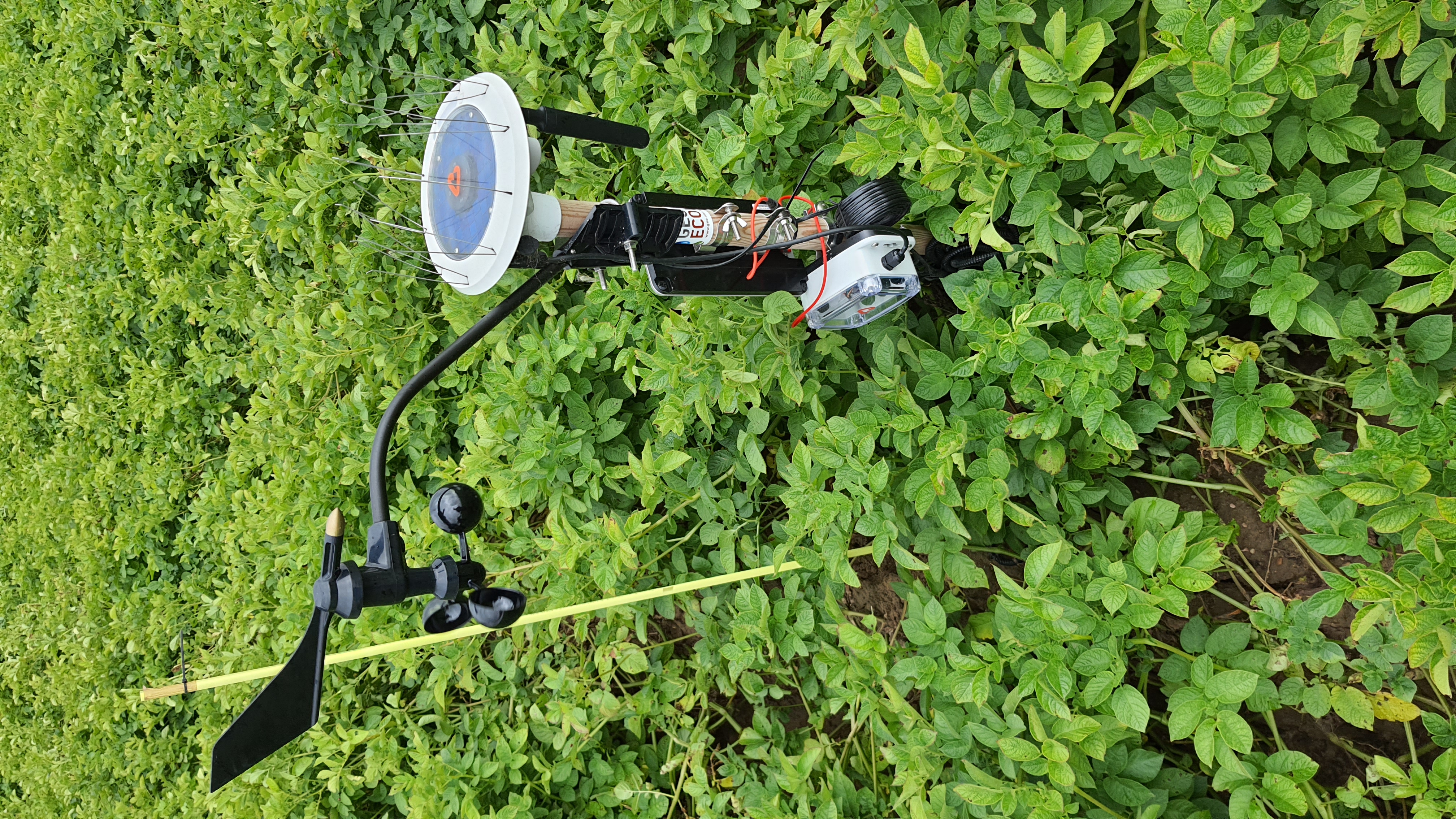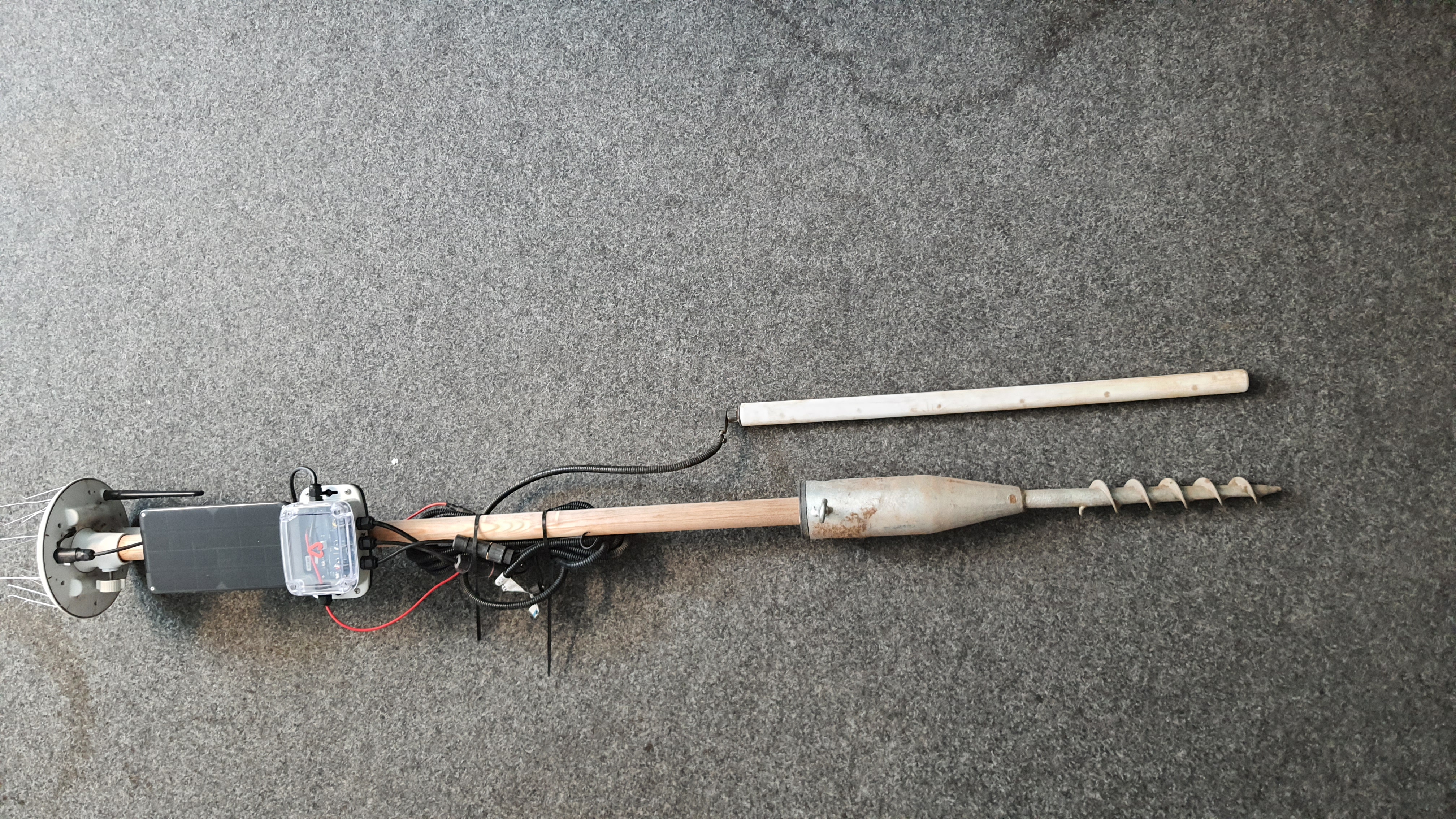 | Zunächst muss die Arable-Station zusammen mit der Bodenfeuchtesonde im Feld installiert werden. Hierzu gibt es zwei Möglichkeiten: Falls ein Bodenanker genutzt wird (siehe Foto), muss dieser in den Boden geschraubt und im Anschluss die Arable-Station befestigt und ausgerichtet werden. Falls kein Bodenanker genutzt wird, muss mittels Akkubohrer und entsprechenden Aufsatz (siehe Foto) ein Loch in den Boden gebohrt werden. Auch ohne Anker steht die Station fest im Feld, sodass hierauf verzichtet werden kann. Die Installation erfolgte jeweils zwischen zwei Häufel. In beiden Fällen ist jedoch darauf zu achten, dass sich die Höhe der Sensoreinheit ca. 20 cm oberhalb der maximalen Bestandeshöhe befindet. In unserem Fall war von einer maximalen Bestandeshöhe von ca. 65 cm auszugehen, sodass sich der Sensor in etwa 80 cm oberhalb der Häufel befindet. Hiervon ist auch abhängig, wie lang der Befestigungsstab und wie tief das Loch im Boden zur Befestigung sein muss. In unserem Beispiel hieß das: Häufelhöhe ca. 30 cm + maximale Bestandeshöhe ca. 65 cm + Abstand zum Bestand ca. 20 cm = 115 cm. Wir nutzen deswegen zur Befestigung eine 150 cm lange Metallrohre mit einem Durchmesser von 4 cm, die wir 35 cm tief in den Boden eingebracht haben. Die Ausrichtung der Station erfolgt so, dass das Solarmodul in Richtung Osten ausgerichtet wird, die Verbindungseinheit in Richtung Norden und der Sensor auf der Unterseite der Sensoreinheit in südlicher Richtung auf den Häufel ausgerichtet ist (siehe Foto). Die beiliegende Bodenfeuchtesonde ist 60 cm lang und muss in den Häufel eingebracht werden. Hierzu werden in jedem Fall ein Akkuschrauber und ein entsprechender Bohraufsatz benötigt. Dieser Schritt kann vom Anwender durchgeführt und dauert etwa 15 Minuten. |