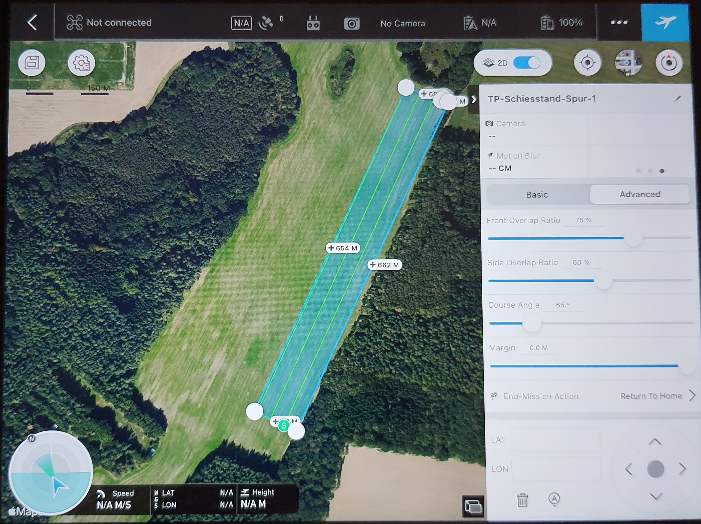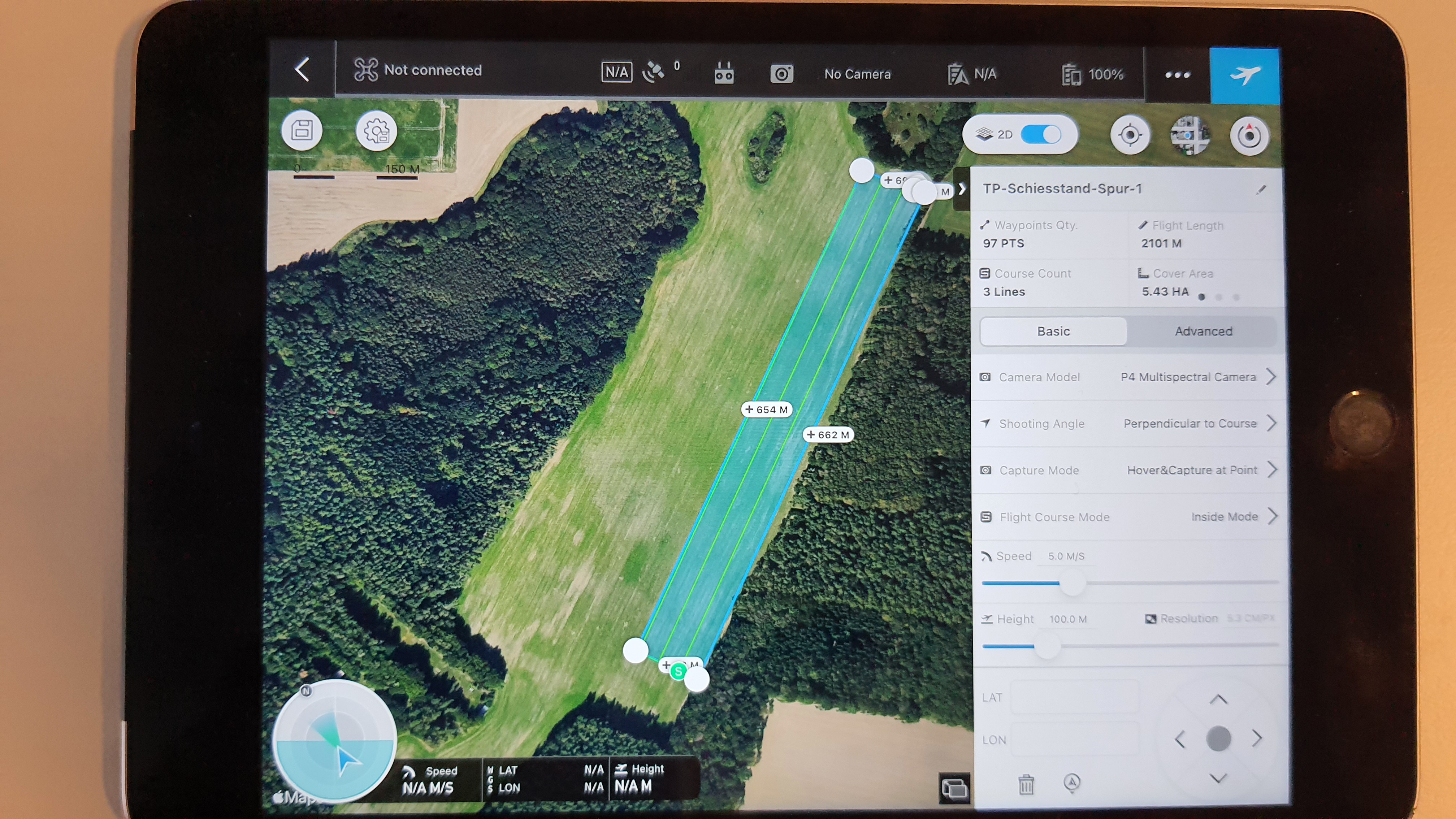 | Die multispektralen Befliegungen finden idealerweise etwa 1 Mal pro Woche statt. Aktuell arbeiten wir an einer Verbesserung des Modells, die auch eine geringe zeitliche Auflösung zulässt bzw. ersatzweise auf Satellitendaten zurückgreift. Die Befliegungsrouten selbst werden mittels der App "Pix4D Capture" geplant und durchgeführt. Eine Flughöhe von 100 m bei einer Geschwindigkeit von 5 m / Sek sowie eine Überlappung in Flugrichtung von 75 % und eine seitliche Überlappung von 60 % haben sich als ideale Parameter herausgestellt, um alle Details zu erhalten, aber dennoch möglichst datensparsam zu fliegen. Da mit einer Akkuladung nicht immer das gesamte Feld, sondern maximal ca. 8 ha abgedeckt werden können, müssen ggf. mehrere Flugrouten programmiert und geflogen werden. Die Befliegung einer Fläche von ca. 6 ha dauert je nach Windgeschwindigkeit und -richtung zwischen 12 und 18 Minuten. Die Einzelaufnahmen werden auf einer MicroSD-Karte gespeichert und können manuell auf den PC übertragen werden, wo die Auswertung stattfindet. |