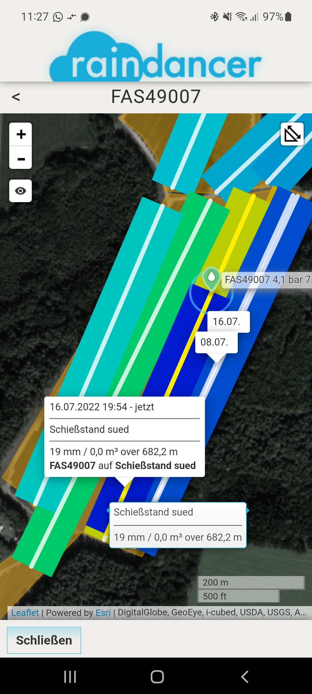 | Die Software "Raindancer" kann sämtliche Beregnungsvorgänge mit einer zeitlichen Auflösung von 7 Minuten loggen, sodass für den in diesem Zeitraum beregneten Bereich auch eine Beregnungshöhe ermittelt werden kann. Da die Auswertung bis zur fertigen Beregnungshöhe aber sehr anspruchsvoll und effektiv nur durch eine Programmiersoftware ermittelt werden kann, empfiehlt sich die Beauftragung eines Dienstleisters. Dennoch wird die von uns entwickelte Methode im Jahr 2023 zur freien Verfügung veröffentlicht werden. Updates werden natürlich auch hier bekanntgegeben. |