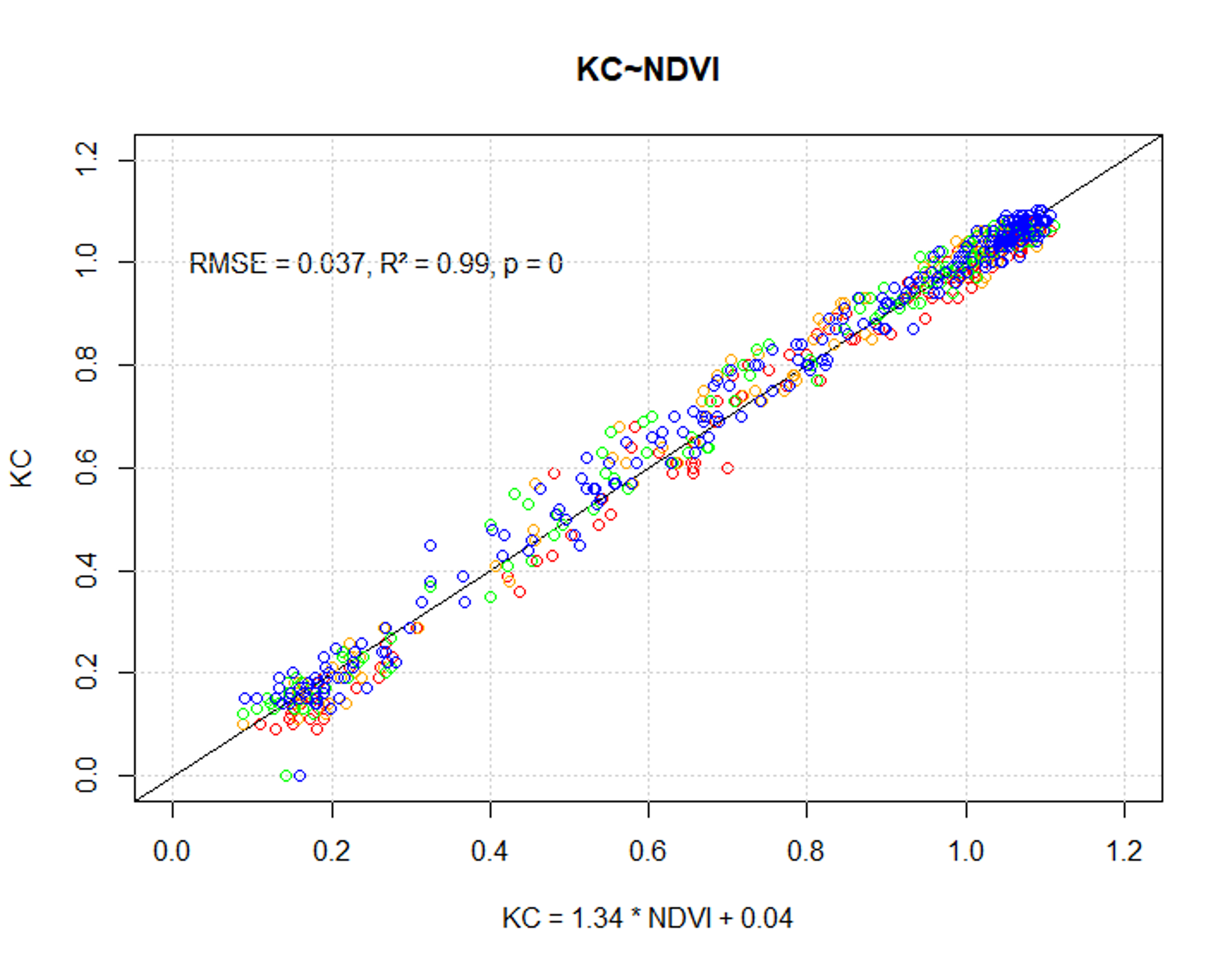 | Um die pflanzenspezifische Verdunstung zu ermitteln, ist es notwendig, den pflanzenspezifischen Koeffizienten (Kc) zu bestimmen. Dieser wird zwar bereits von den Arable Mark 2 - Stationen ausgegeben, jedoch nicht von den UAV-Daten, sodass hier ein "Bindeglied" fehlt. Bindeglied ist der NDVI. Deswegen kann der Pflanzenkoeffizient nicht direkt genutzt werden, sondern muss aus den NDVI-Daten - und hier zunächst aus den Arable Mark 2 - NDVI - Daten modelliert werden. Dies ist, wie der Name schon vermuten lässt, pflanzenspezifisch - genauer gesagt, kulturspezifisch. Aktuell haben wir den Pflanzenkoeffizienten aus NDVI - Daten nur für die Stärkekartoffelsorte "Henriette" modelliert. Mit der Vegetationsperiode 2023 planen wir aber weitere Kulturen hinzuzufügen. Da die Modellierung eines intensiven fachlichen Wissens bedarf, empfehlen wir hier auf externe Dienstleister auszuweichen oder unsere Modelle zu nutzen, die wir im Laufe des Jahres 2023 veröffentlichen werden. Zu Umsetzung der Modellierung nutzen wir die Scriptsprache RStudio. |