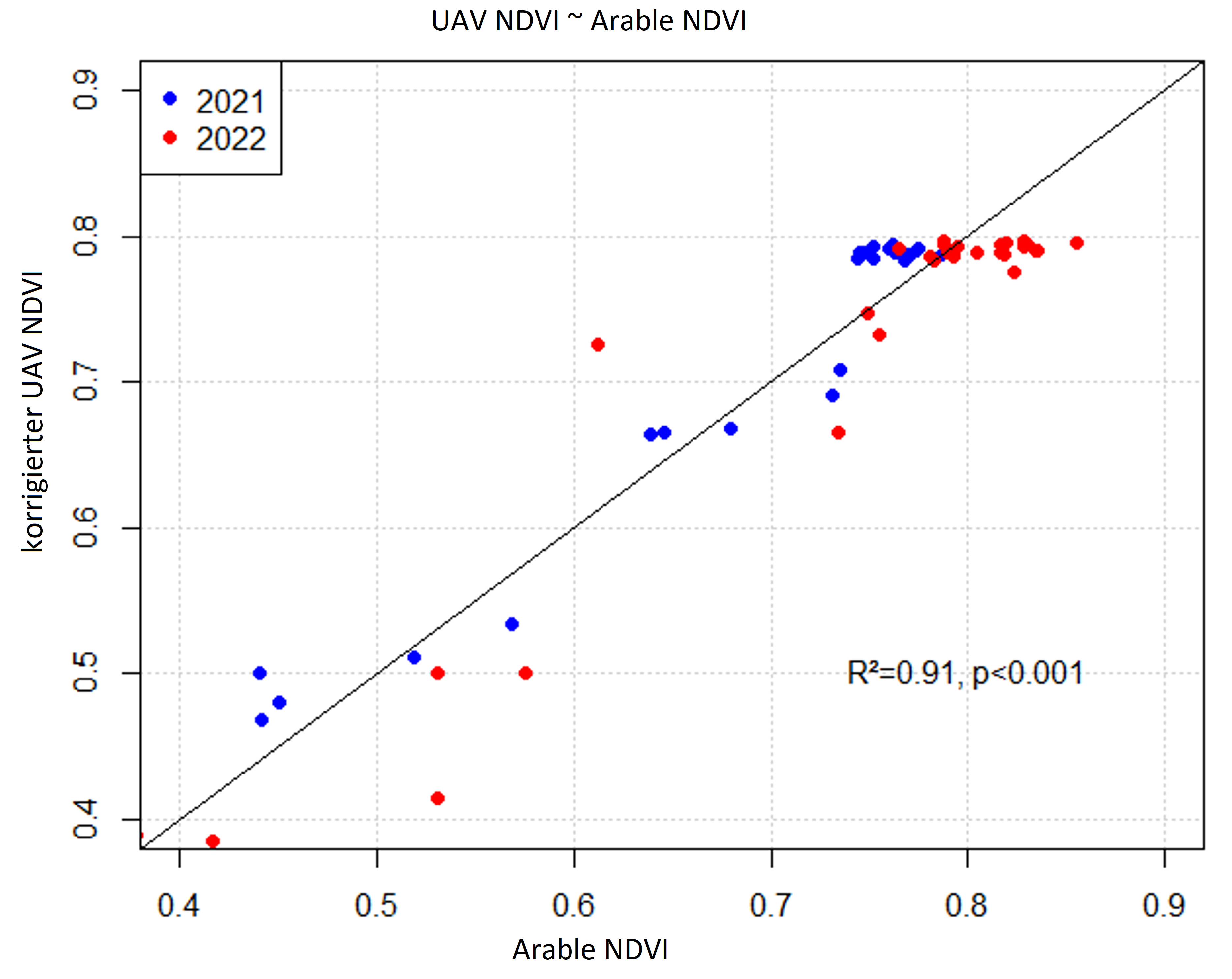 | Da die Modellierung des Pflanzenkoeffizienten (Kc) an Hand der NDVI-Daten der Arable-Stationen geschieht, jedoch die NDVI-Daten der Drohne für die flächenhaften Daten genutzt werden sollen, ist es notwendig, die Daten entsprechend anzupassen. Die Notwendigkeit resultiert hier einerseits aus den unterschiedlichen Sensoren zwischen Arable Arable Mark 2-Stationen (Punktspektrometer) und der Drohne (Kamerasystem). Andererseits bedingt die Flughöhe von 100 m gegenüber der Feldstation eine um fast 100 m größere Luftschicht zwischen Vegetation und Drohne, die zu anderen Ergebnissen führt, als wenn die Aufnahmen nur wenige cm über dem Bestand gemacht werden, wie z.B. mit der Arable Mark 2-Station. Diese beiden Unterschiede müssen mittels eines Modells korrigiert werden. Das Modell ist aktuell nur für die Stärkekartoffel "Henriette" verfügbar. Weitere Kulturen sollen nach der Vegetationsperiode 2023 folgen. Zur Umsetzung der Modellierung nutzen wir die Scriptsprache RStudio. |