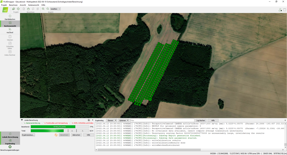 | Die Einzelaufnahmen können im Anschluss zu einem Orthomosaik ausgewertet werden. Hierzu nutzen wir die Software Pix4D Mapper. Da diese jedoch Lizenzgebühren verlangt, kann alternativ auch auf Open Source Software zurückgegriffen werden. Die Standardeinstellung der Software hinsichtlich der Multispektralaufnahmen kann übernommen werden. Da neben der Berechnung des Orthomosaiks aber auch NDVI-Aufnahmen benötigt werden, ist es erforderlich diese selbst zu definieren, da standardmäßig auf eine unkorrekte Kombination der Kanäle zurückgegriffen wird. Hier muss also bei der Berechnung darauf geachtet werden, dass nur die Multispektralkanäle und nicht die RGB-Kamera genutzt wird. |
