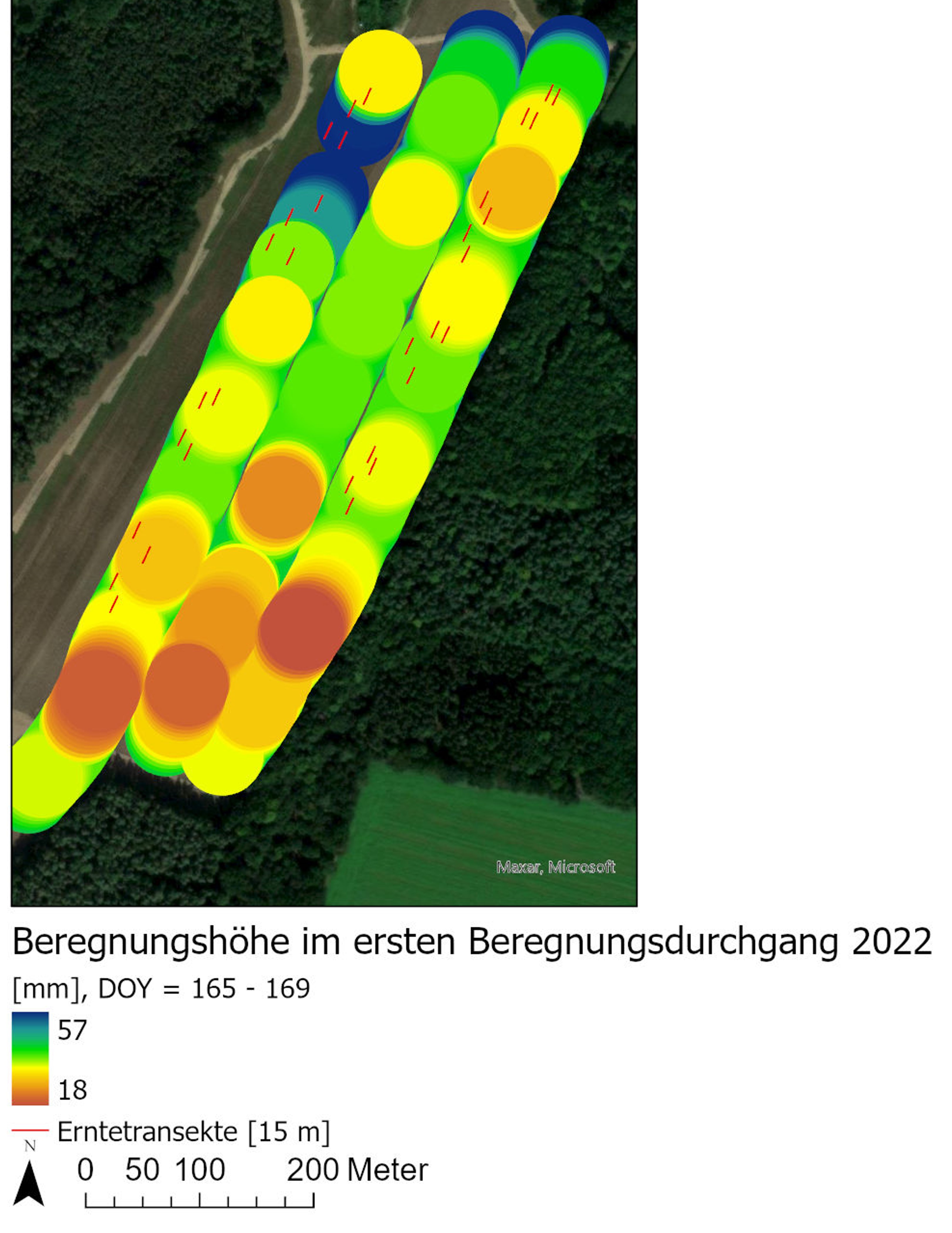 Um unser Ziel zu erreichen, entschieden wir uns für einen multispektralen Ansatz, bei dem im Jahr 2022 insgesamt neun Arable Mark 2 - Stationen auf unserem ca. 13 ha großen Testfeld installierten, die tägliche Informationen zum Pflanzenkoeffizienten, zum NDVI und zur Referenzverdunstung lieferten. Diese täglichen und damit zeitlich hoch aufgelösten, aber räumlich nur punktuell aufgenommenen Daten wurden durch regelmäßige multispektrale Drohnenbefliegungen ergänzt, sodass flächenhafte, und damit räumlich hoch aufgelöste Daten generiert werden können, mit deren Hilfe die Evapotranspiration - also der "Output" eine Wasserbilanz - modelliert werden kann. Als äquivalente Inputdaten dienten Niederschlagsdaten, die wir aktuell aus den Arable Mark 2 - Stationen beziehen, zukünftig aber optional aus einem Wetterradar erhalten werden, sowie Beregnungsdaten, die wir aus dem Beregnungssoftware "Raindancer" exportieren. Um eine möglichst große Varianz bei den räumlichen Modelldaten zu erhalten, wurde die Beregnungsmenge auf zwei von vier Beregnungsspuren auf jeweils vier variierende Höhen eingestellt, die über eine Länge von jeweils ca. 170 m beibehalten wurden. Damit ergab sich ein experimentelles Design, das aus zwei Beregnungsspuren mit jeweils 4 Beregnungsplots bestand. Zusätzlich installierten wir einen unbewässerten Plot, der als Kontrolle diente. Jeder Plot verfügte über eine Arable Mark 2 - Station mit angeschlossener Bodenfeuchtesonde (Sentek, 60 cm), sowie jeweils zwei Pessl-Stationen mit angeschlossener Bodenfeuchtesonde (Sentek, 60 cm). Die Auswertung der Befliegungsdaten erfolgte mit Hilfe der Software Pix4D Mapper, durch die nach jeder Befliegung ein NDVI-Orthomosaik des Feldes erstellt wurde. Aus den NDVI-Daten, die die Arable Mark 2- Stationen aufgenommen haben, wurden die Werte des Pflanzenkoeffizienten modelliert. Außerdem wurden die NDVI-Daten aus den Drohnenbefliegungen an die NDVI-Daten aus den Arable Mark 2 - Stationen angepasst, sodass im nächsten Schritt der Pflanzenkoeffizient auch räumlich ermittelt werden konnte. Die Referenzverdunstung, die die Arable Mark 2 - Stationen ermitteln haben, war über das Feld nahezu gleichverteilt, sodass diese zusammen mit dem Pflanzenkoeffizienten als pflanzenspezifische Evapotranspiration mit ETc = ET0 * Kc berechnet werden konnte. Damit stand für jedes Pixel und jeden Befliegungsdurchgang ein "Output" der Wasserbilanz fest. Da die Befliegungen nur ein Mal pro Woche erfolgte, wurden die dazwischen liegenden Tage interpoliert, sodass für jeden Tag und jeden Pixel ein Wert vorlag. Der "Input" des Modells wurde durch Niederschlag und Beregnung definiert. Die Niederschlagsdaten wurden durch die Arable Mark 2 - Stationen ermittelt und täglich inkludiert. Die Beregnungsdaten konnten wir aus der Software "Raindancer" nach jedem Beregnungsdurchgang exportieren. Durch eine räumliche Verschneidung der Daten wurde damit jedes Pixel seine individuelle Bewässerungshöhe zugewiesen. So ergibt sich das Wasserbilanzmodell mit WB = -ETc + Nd + Ir (mit ETc = pflanzenspezifische Evapotranspiration, Nd = Niederschlag, Ir = Beregnung). Die Werte wurden für jedes Pixel jeden Tag kumuliert, sodass sich die Wasserbilanz über die Vegetationsperiode entwickelt.