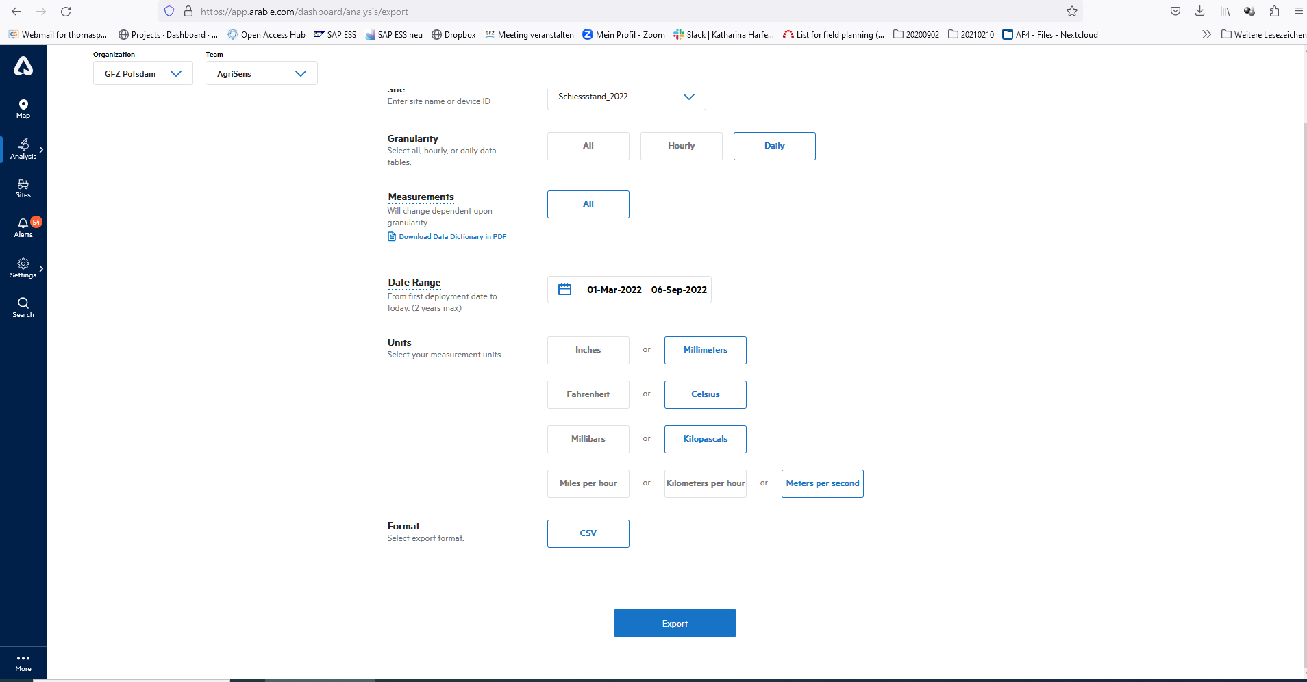 | Die Niederschlagdaten aus den Arable Mark 2 - Stationen können entweder regelmäßig aus der Benutzeroberfläche abgerufen werden oder mittels selbst erstellter API abgefragt werden. Da auch dieser Schritt anspruchsvoll ist, empfiehlt sich auch hier die Nutzung eines Dienstleisters. Wenn die Daten als Excel-Tabelle vorliegen, können sie im nächsten Schritt (zusammen mit den bisher erzeugten Teilergebnissen) in das Wasserbilanzmodell eingehen. |