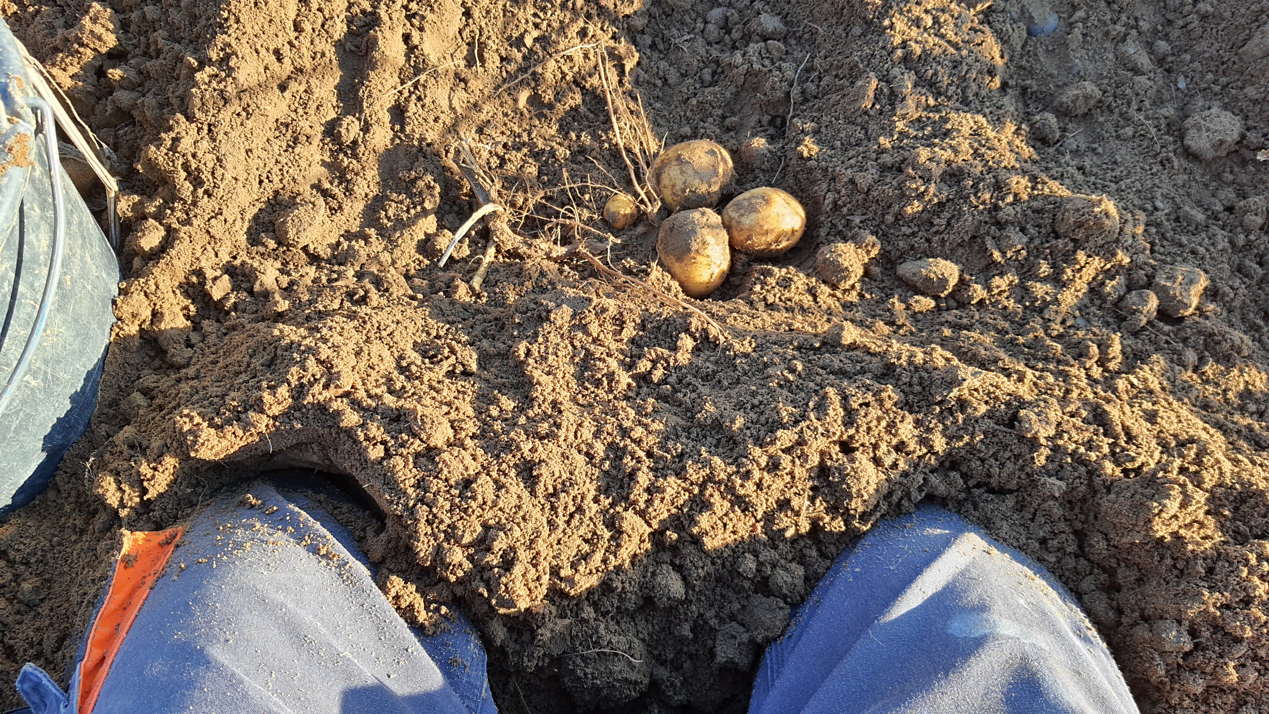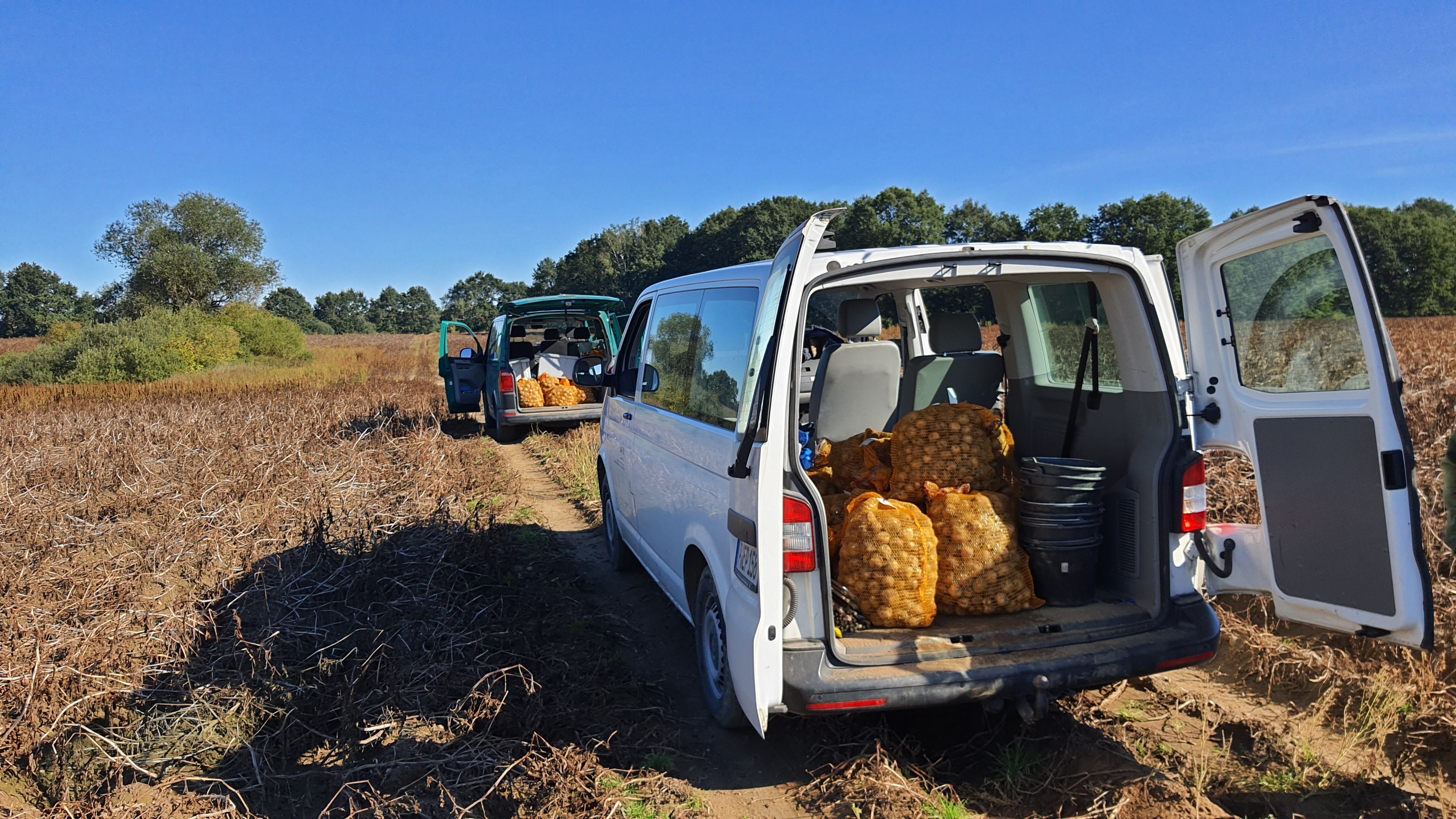 | Neben der eigentlichen Modellierung der Wasserbilanz haben wir auch eine Erntekampagne durchgeführt, um die Erträge mit den jeweils lokalen Wasserbilanzen korrelieren zu können. Hierzu haben wir in den zuvor definierten Bewässerungsplots jeweils vier Erntetransekte mit einer Länge von jeweils 15 m und einer Breite von jeweils einer Reihe festgelegt und manuell geerntet, sowie ausgewogen und den Stärkegehalt (Tauchwaage) bestimmt. Diese Ergebnisse dienen in einem nächsten Schritt, das Modell hinsichtlich der idealen Beregnungshöhe zu trainieren. Da hierfür aber mehrere Jahre notwendig sind, wird dieser Modellteil erst Ende 2023 oder 2024 veröffentlicht werden können. |