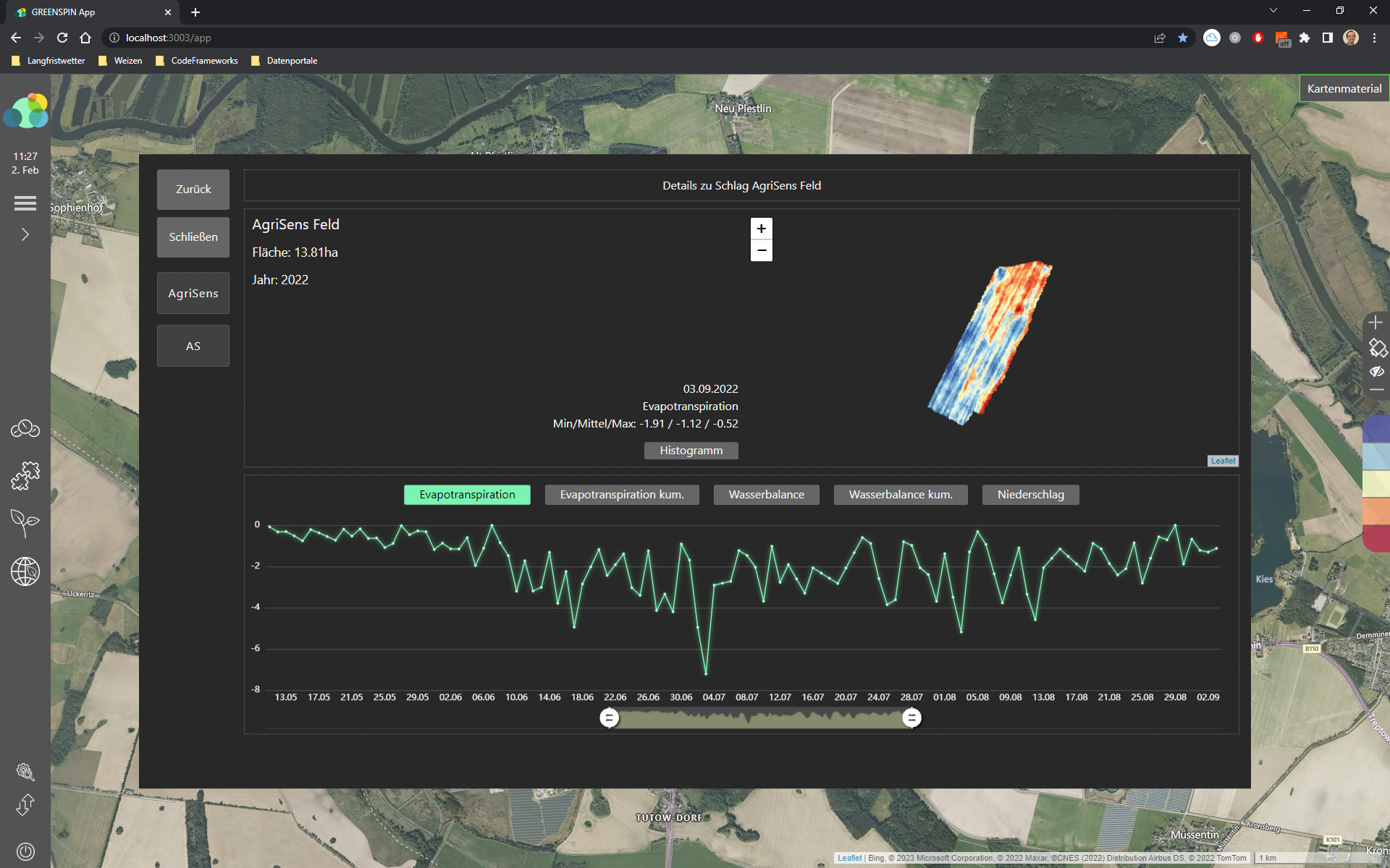 | Die Integration der Modellbestandteile wurde im letzten Schritt mittels RStudio erzielt. Als Ergebnis stellt sich hier für jeden Tag in der Vegetationsperiode ein räumliches Wasserbilanzmodell für den jeweiligen Schlag dar. Da der Umgang mit RStudio ein breites Fachwissen erfordert, empfehlen wir hierfür einen externen Dienstleister in Anspruch zu nehmen. Dieser externe Dienstleister übernimmt alle gewünschten Prozesse und stellt das Ergebnis übersichtlich in einer Benutzeroberfläche zur Verfügung (siehe Abbildung "Benutzeroberfläche (1)"). Alternativ ist auch eine vereinfachte Abbildung mittels ArcGIS Online nutzbar, die selbst erstellt werden kann (siehe Abbildung "Benutzeroberfläche (2)"). |