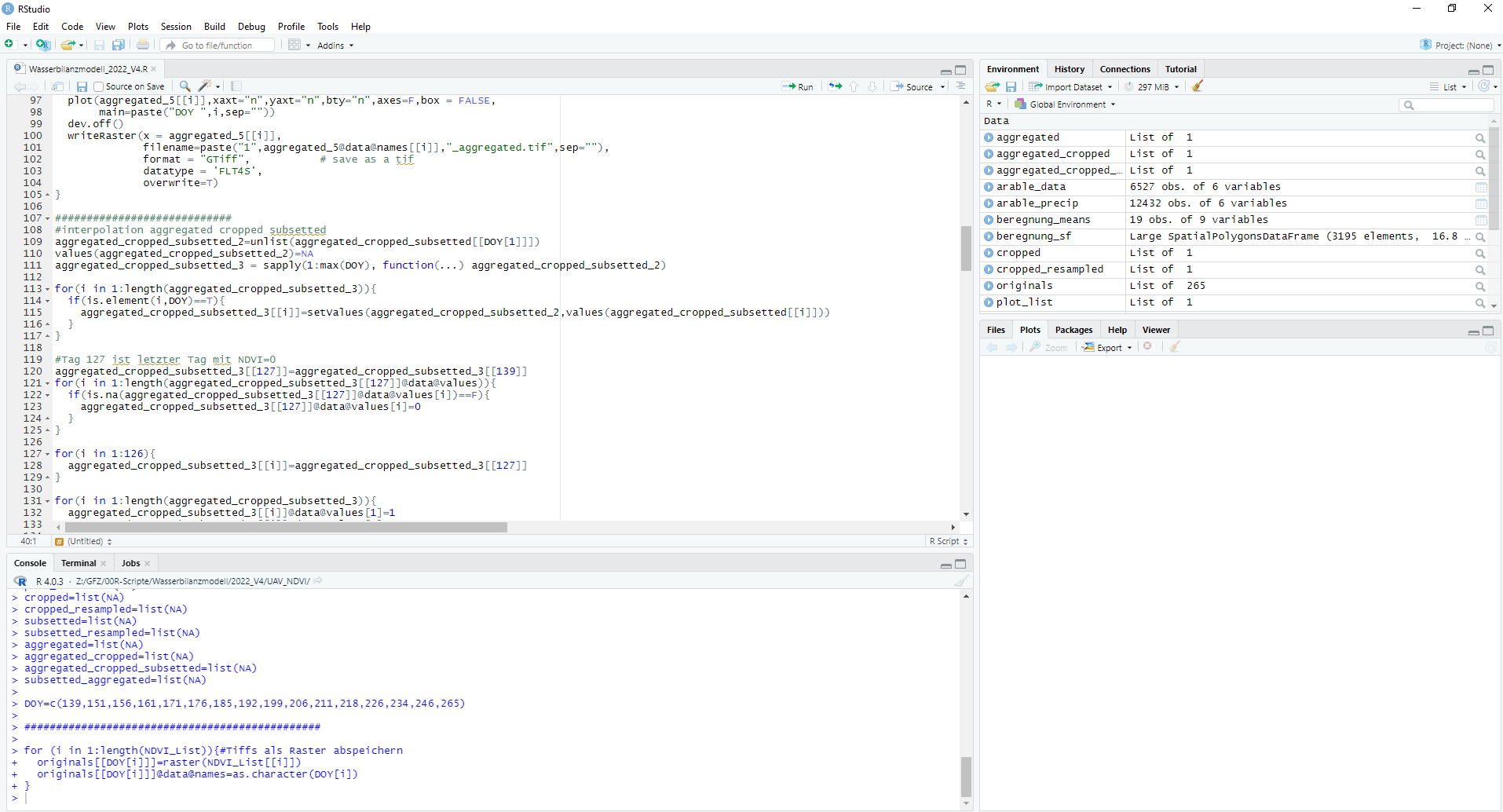 | Um alle Daten aus UAV-Befliegungen, den Arable Mark 2 - Stationen und "Raindancer" miteinander zu verarbeiten, nutzen wir die Programmiersprache R. Das Programm RStudio ist frei verfügbar, jedoch sind hier umfangreiche Kenntnisse in der Programmiersprache Voraussetzung. Die Scripte, die hier ausgeführt werden müssen, werden wir zwar im Jahr 2023 zur freien Verfügung stellen, jedoch müssen die Scripte zusammen mit den Eingangsdaten konfiguriert werden, wofür ebenfalls umfangreiche Kenntnisse notwendig sind. |