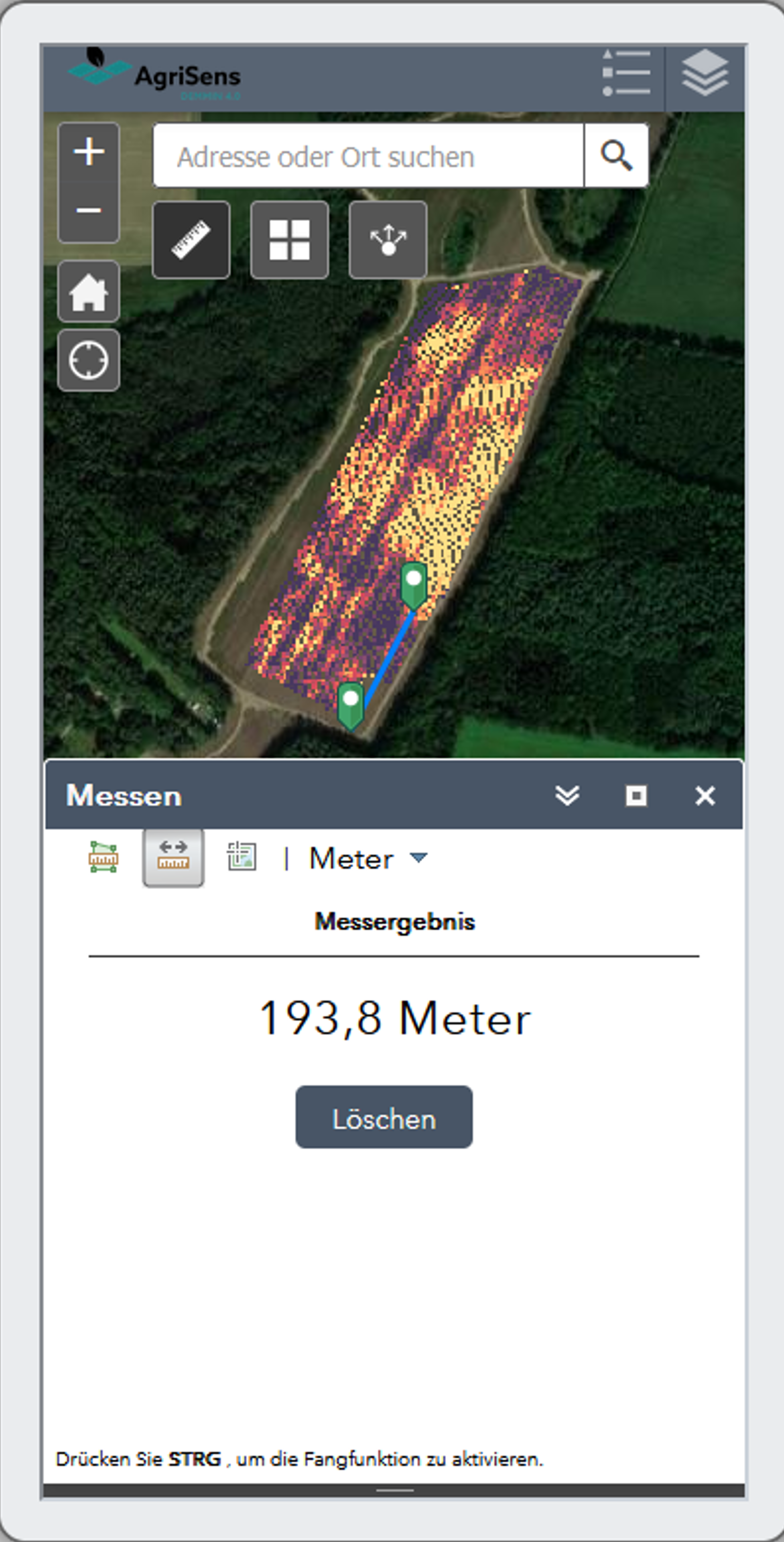 Das Ergebnis stellt sich als eine täglich aktualisierte Karte des Schlages dar, die mit einer räumlichen Auflösung von bis zu 5 m auch kleine individuell zu beregnende Bereiche ausgibt. Hier kann der Landwirt Bereiche identifizieren, die beim nächsten Beregnungsdurchgang einer größeren Beregnungsfläche bedürfen oder bei denen Wasser eingespart werden kann.