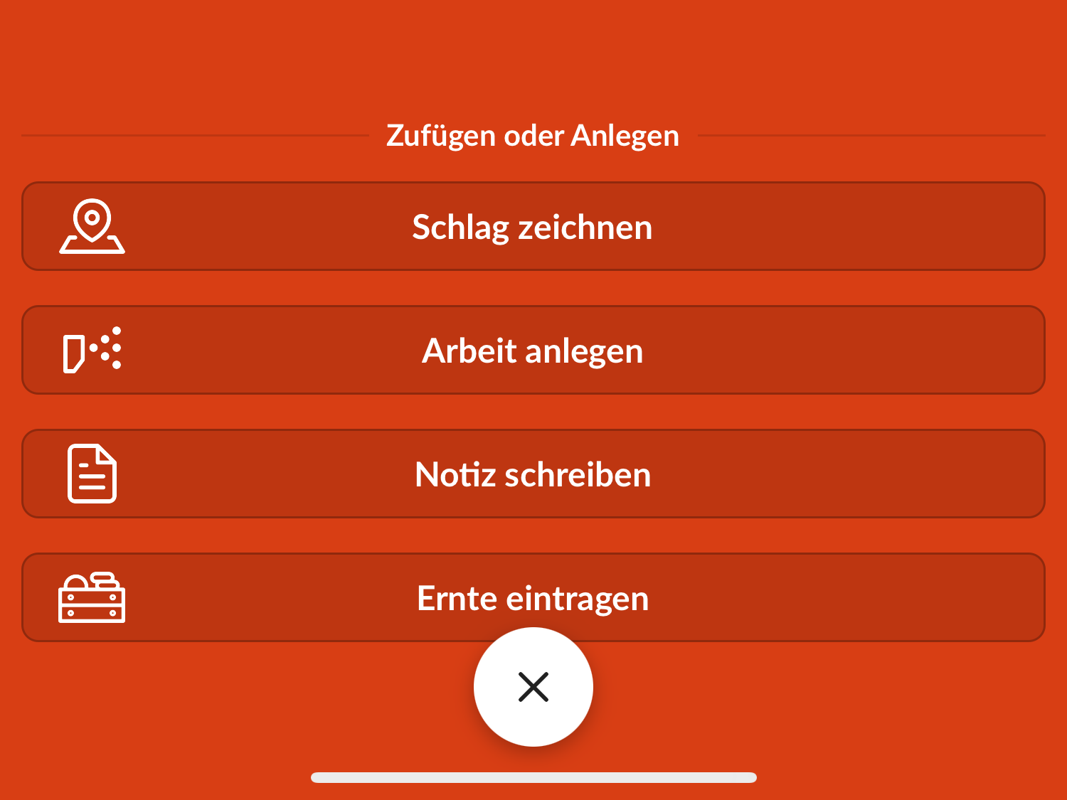 | Um Arbeiten auf Ihren Flächen dokumentieren zu können, müssen diese importiert werden. Die Flächen können in der App (Smartphone) eingezeichnet werden, indem Sie unten in der Mitte auf das orangene Plus-Symbol klicken, danach auf "Schlag zeichnen" klicken und Sie dann auf die Ecken Ihrer Fläche tippen. Zu der eingezeichnete Fläche werden dann genauere Angaben gemacht (Name, Kultur, Sorte, Pflanzdatum). Eine alternative Möglichkeit ist es, eine Datei der Flächen in das Farmable Web Portal zu importieren. Eine genaue Anleitungen dazu finden Sie unter https://support.farmable.tech/de/articles/6172297-so-fugst-du-deinem-betrieb-neue-schlage-hinzu |