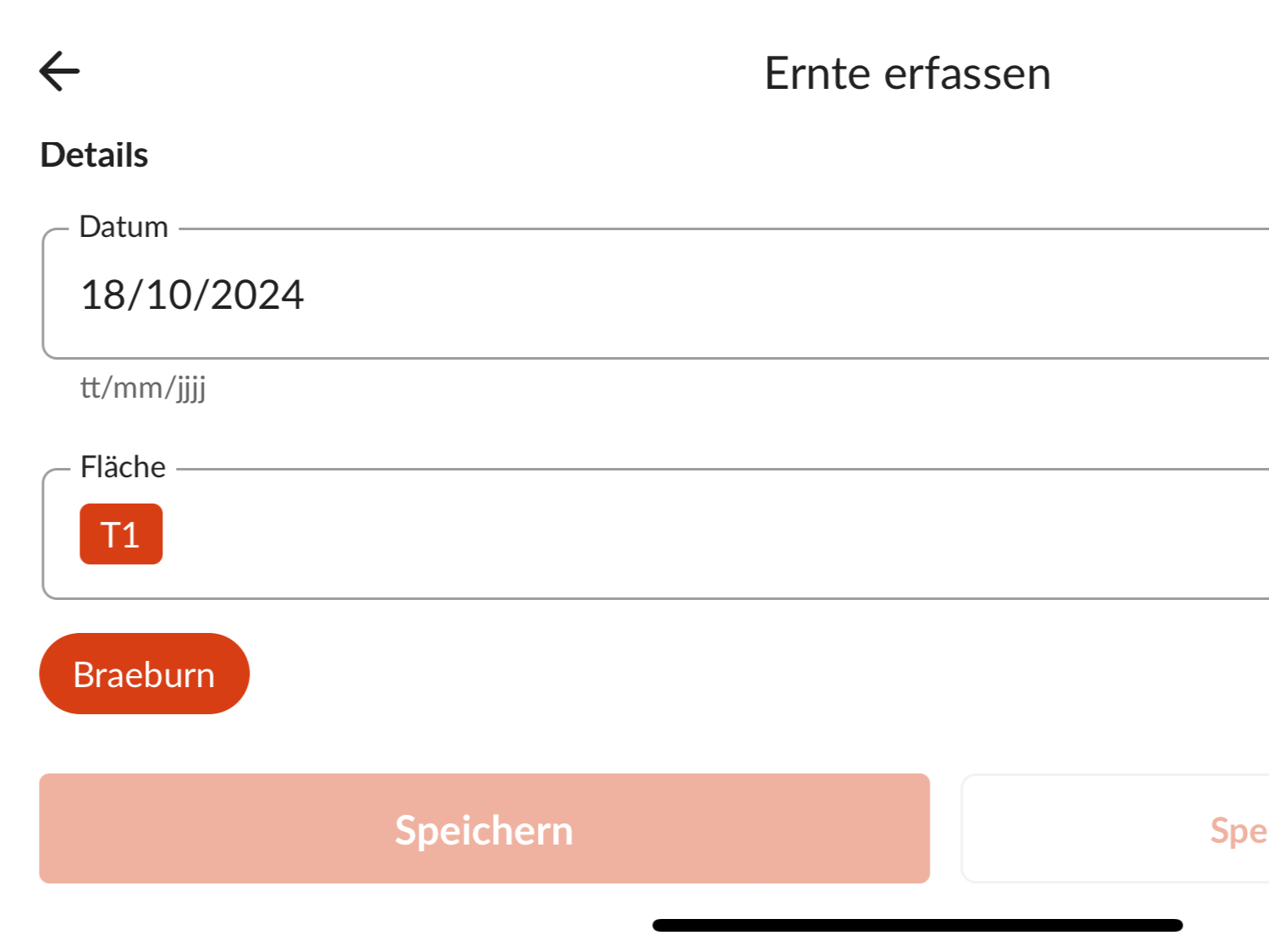 | Jetzt können Sie Details zur Ernte eintragen. Wählen Sie aus, an welchem Datum und auf welcher Fläche geerntet wird. Tippen Sie dazu auf "Datum", um einen Tag im Kalender auszuwählen und tippen Sie unten auf "Wählen". Tippen Sie danach auf das Feld "Fläche" und wählen Sie in der Übersicht den Schlag aus, auf dem geerntet wird. (Wenn auf mehreren Flächen dieselbe Sorte angebaut wird, können auch mehrere Flächen ausgewählt werden.) Sie können Ihre Schläge auch nach Kultur filtern, sich also beispielsweise nur Schläge mit Äpfeln anzeigen lassen. Klicken Sie dazu oben links auf "Kultur". Tippen Sie dann oben auf rechts auf "Speichern". |