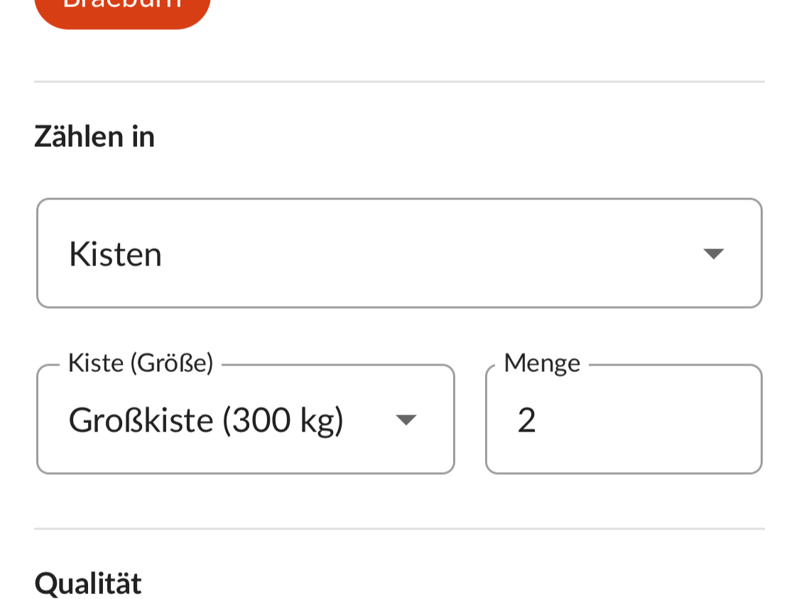 | Geben Sie dann an, ob in Kisten oder in Gewicht gezählt werden soll. Wenn Sie in Kisten zählen möchten, müssen Sie zunächst eine neue Kiste hinzufügen. Klicken Sie dazu auf "Kiste (Größe)", benennen Sie die Kiste und geben Sie an, wie viel Kilogramm in diese passen. Tippen Sie auf speichern. Jetzt können Sie die Menge der Kisten eingeben. Möchten Sie in Gewicht zählen, müssen Sie nur die Menge in Kilogramm angeben. |