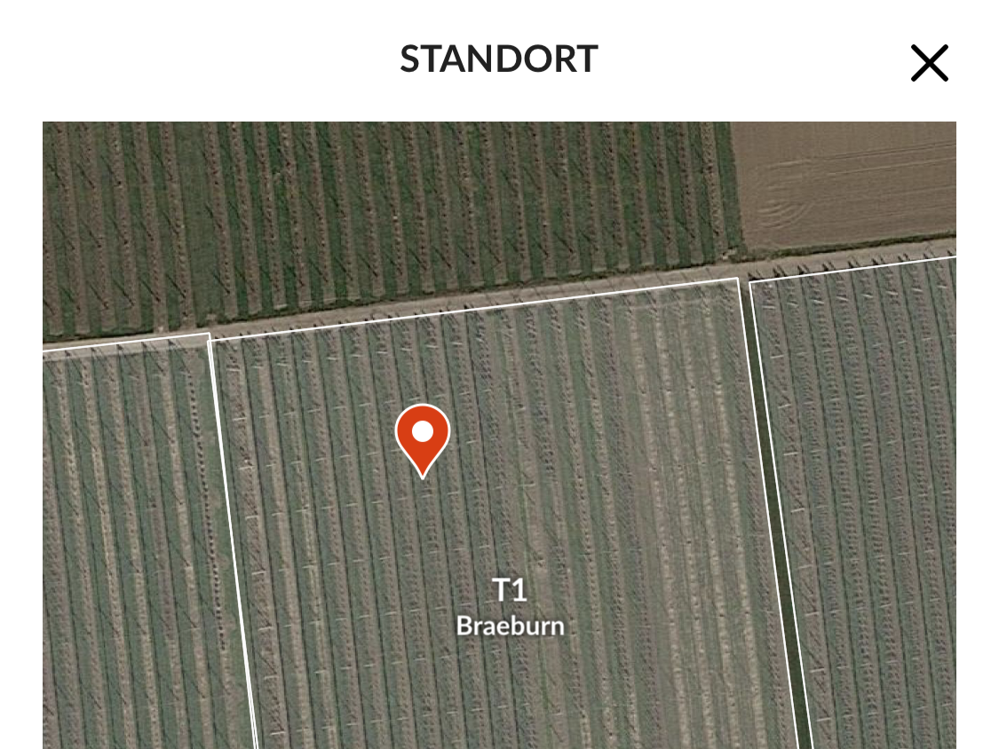 | Neben dem Anfügen eines Fotos ist es möglich, den genauen Standort anzugeben. Klicken Sie dazu auf das Standortsymbol auf der rechten Seite des Bildschirms. Zoomen Sie ran, um die Reihen genauer sehen zu können. Tippen Sie dann auf die gewünschte Stelle auf der Fläche, die Sie markieren möchten. Der Standort wird dann ebenfalls unten in der Erfassung angezeigt. Diese Funktion können Sie zum Beispiel nutzen, wenn Sie an einem einzelnen Baum eine Auffälligkeit beobachten können. |