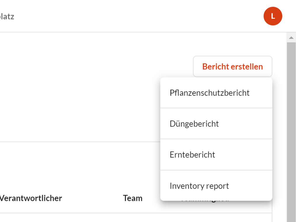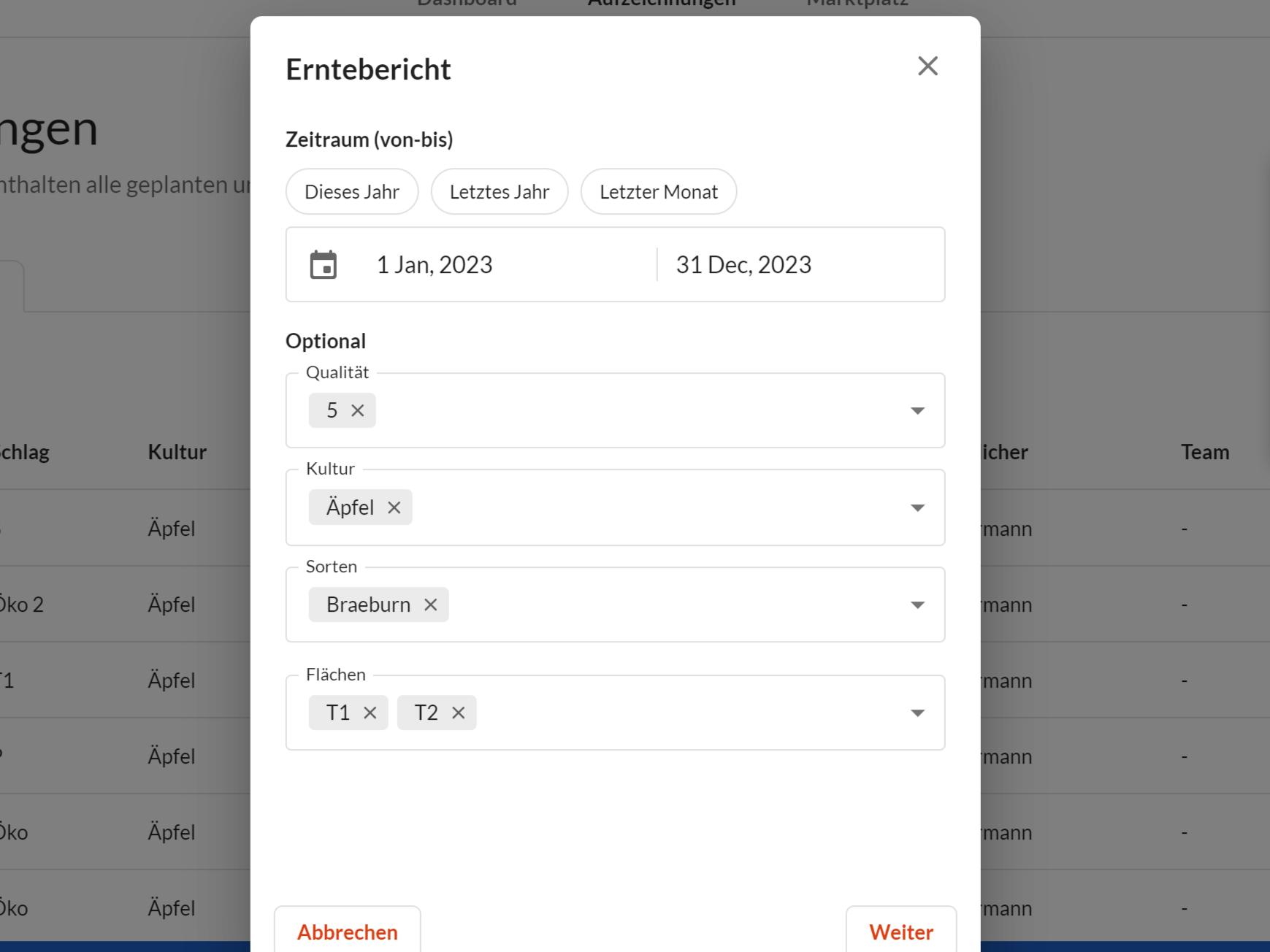 | Um einen Erntebericht zu erstellen, klicken Sie rechts oben auf "Bericht erstellen". Wählen Sie unter den Punkten "Erntebericht" aus. Geben Sie nun an, für welchen Zeitraum Sie den Bericht erstellen möchten. Optional können Sie wählen, was genau im Bericht enthalten sein soll. Dabei können Sie Qualität, Kultur, Sorte und Fläche eingrenzen (hier können mehrere Punkte ausgewählt werden). So können Sie beispielsweise flächen- oder sortenbezogene Ernteberichte erfassen und die Flächen und Sorten miteinander vergleichen. Klicken Sie zum Schluss auf "Weiter". |