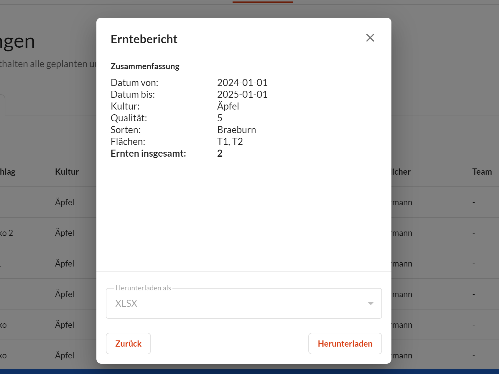 | In der Zusammenfassung des Ernteberichts können Sie nocheinmal überprüfen, ob die Angaben Ihren Wünschen entsprechen. Klicken Sie dann auf "Herunterladen". Der Bericht wird nun als XLSX-Datei heruntergeladen. |