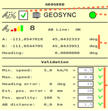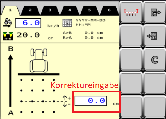 Geosync ist einsatzbereit, wenn der Kreis auf der Geosync Seite grün leuchtet. Beginnen Sie nun wie gewohnt mit der Aussaat. Zeichnen Sie auf der ersten Bahn eine A-B-Linie in dem Tellus auf. Diese A-B-Linie benötigt das System für die Anlage des Musters. Auf der nächsten angrenzenden Bahn kontrollieren Sie die Ablage durch Freilegung einiger Körner und korrigieren einen eventuellen Versatz händisch in der Bedienoberfläche. Wiederholen Sie diesen Schritt bis zur angestrebten Genauigkeit. Die Körner sollten nun von Reihe zu Reihe und von Arbeitsbreite zu Arbeitsbreite das gewünschte Muster ausweisen. Bei Geoseed Level 2 sollte die Kontrolle in der Arbeitsbreite erfolgen sowie zwischen den Arbeitsbreiten. Nur so zeigt sich, ob das Geosync Modul funktioniert. Fahren Sie für ein optimales Ergebnis 5-7 km/h.