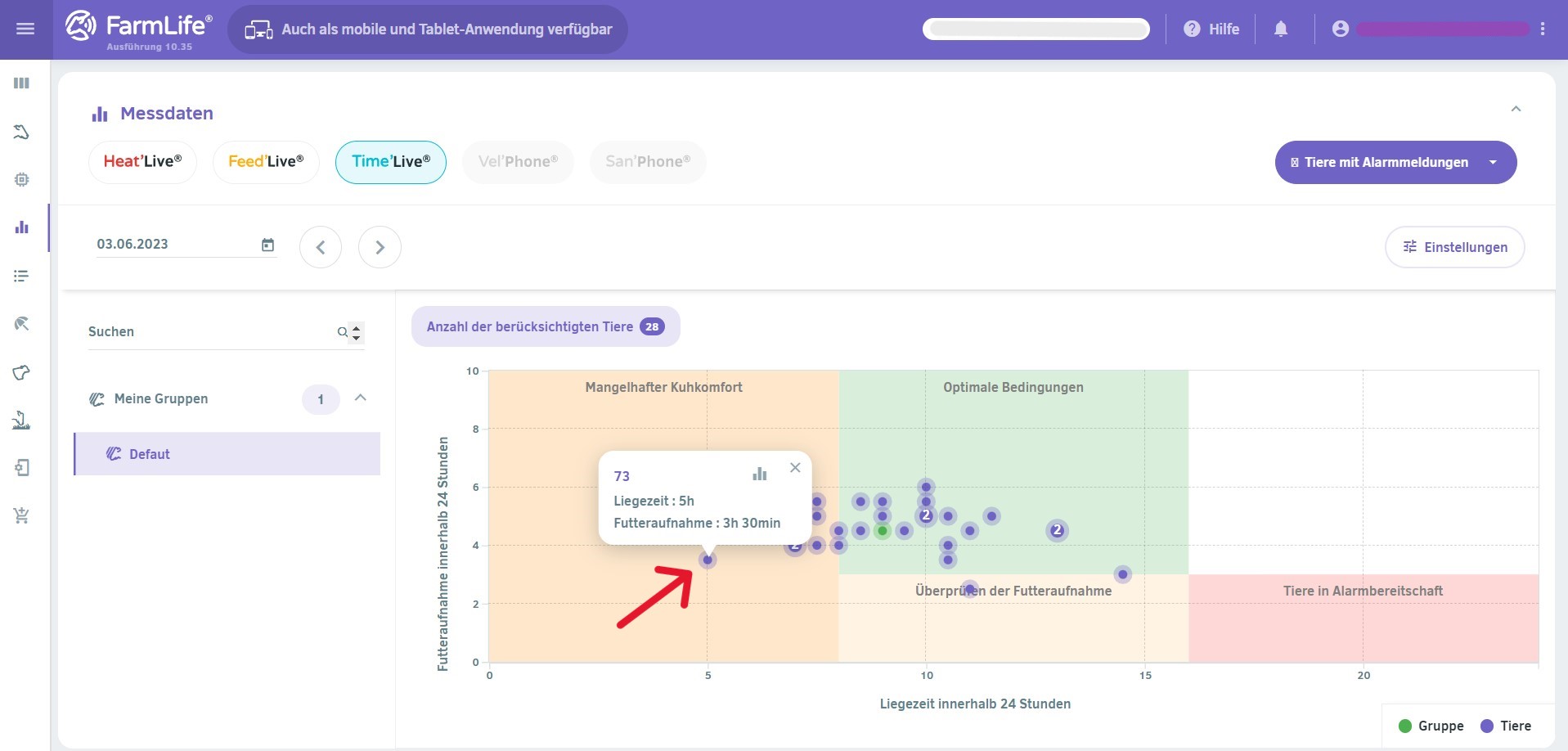 | Auffällige Tiere können einerseits direkt über die Alarmmeldungen im Dashboard erkannt werden. Andererseits besteht die Möglichkeit, einzelne Tiere im Streudiagramm auszuwählen. Hierbei wird dann der exakte Tageswert der Liege- und Futteraufnahmezeit angezeigt. Über das Diagrammsymbol kann zu den Einzeltierdaten gewechselt werden. |