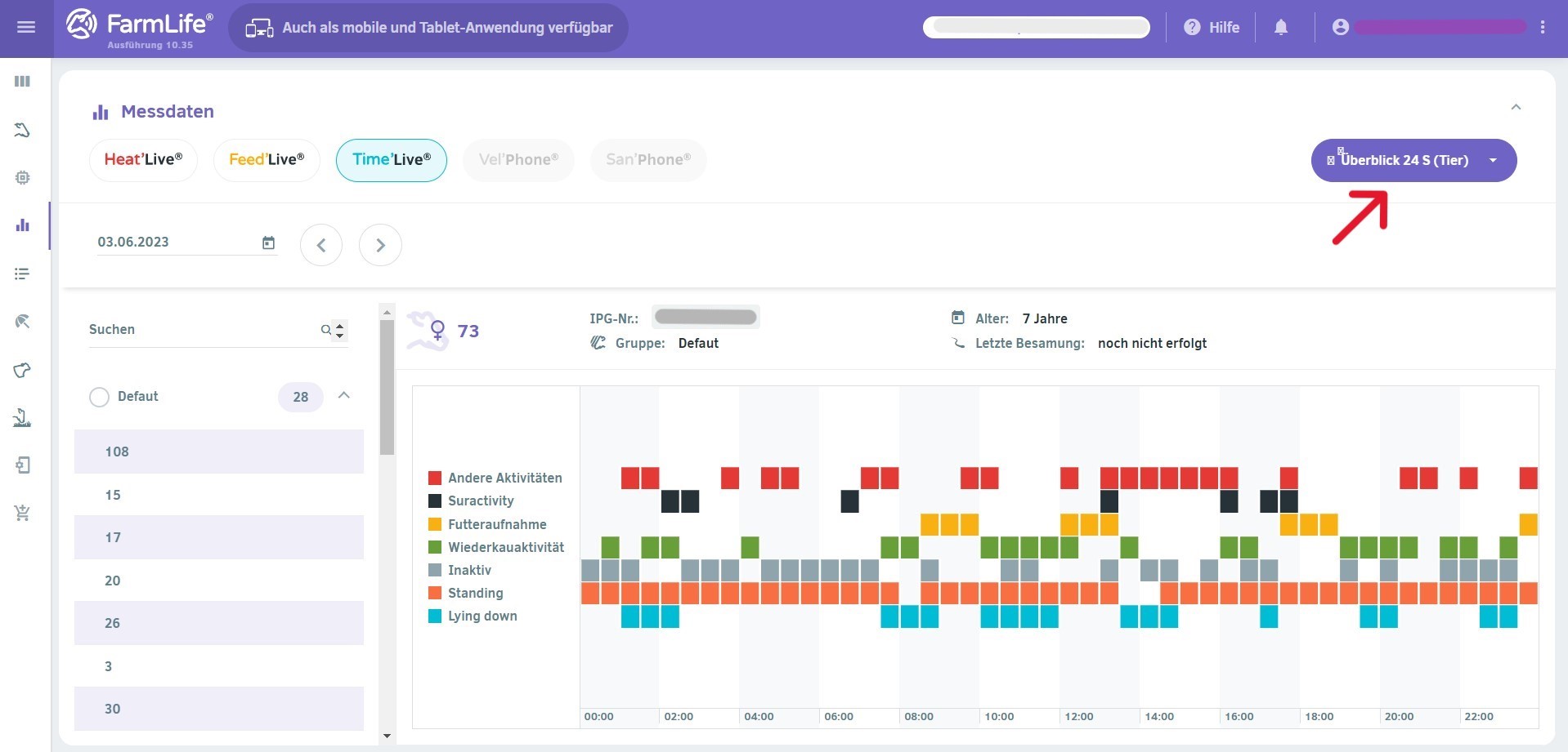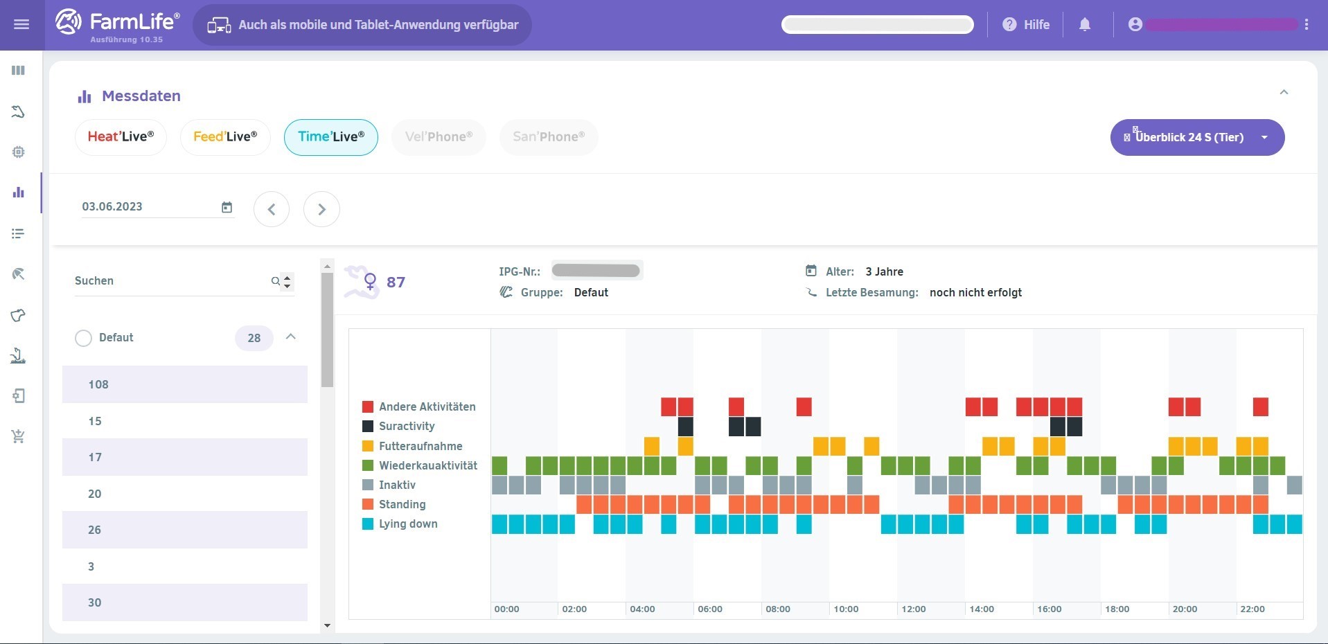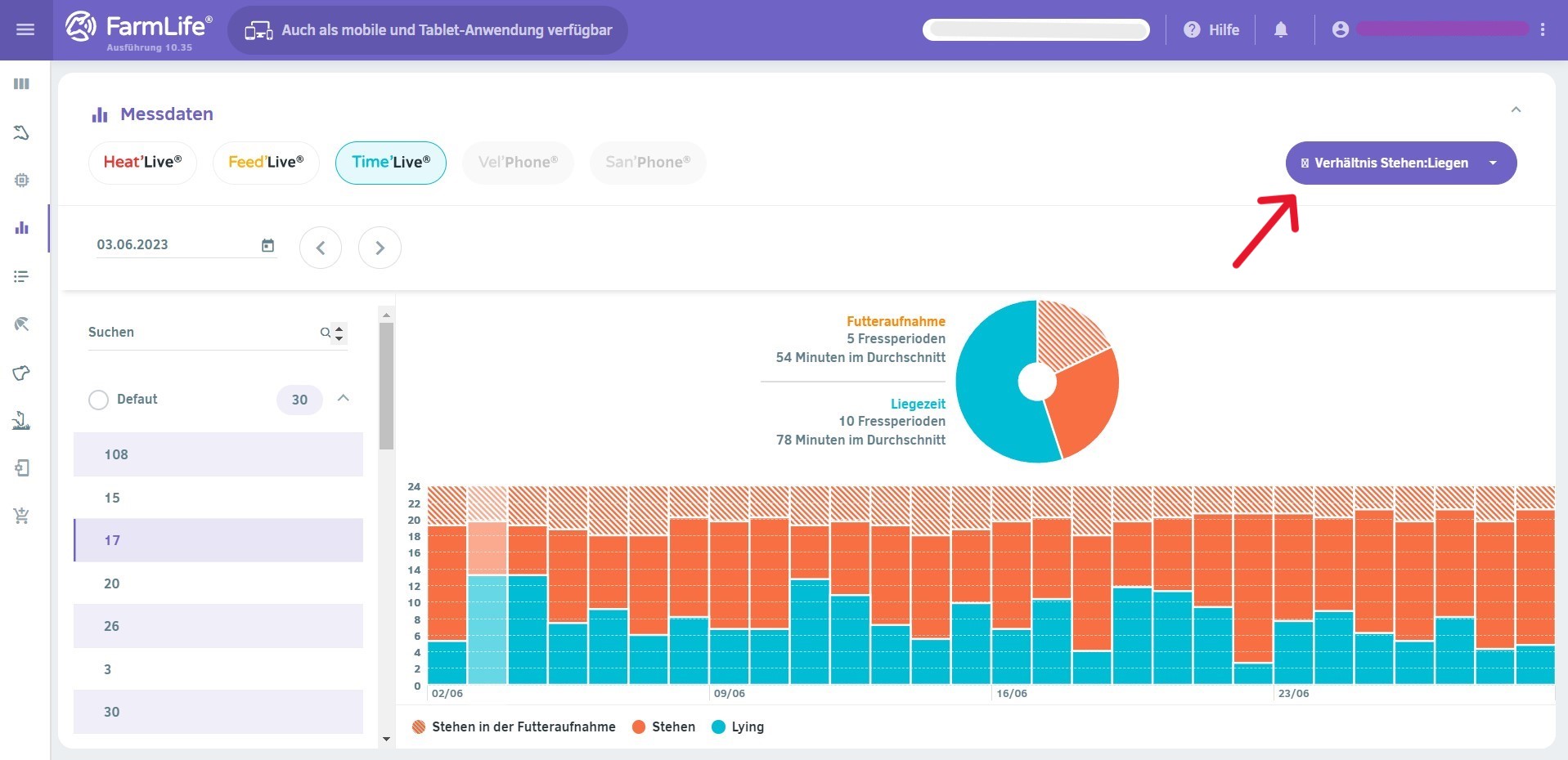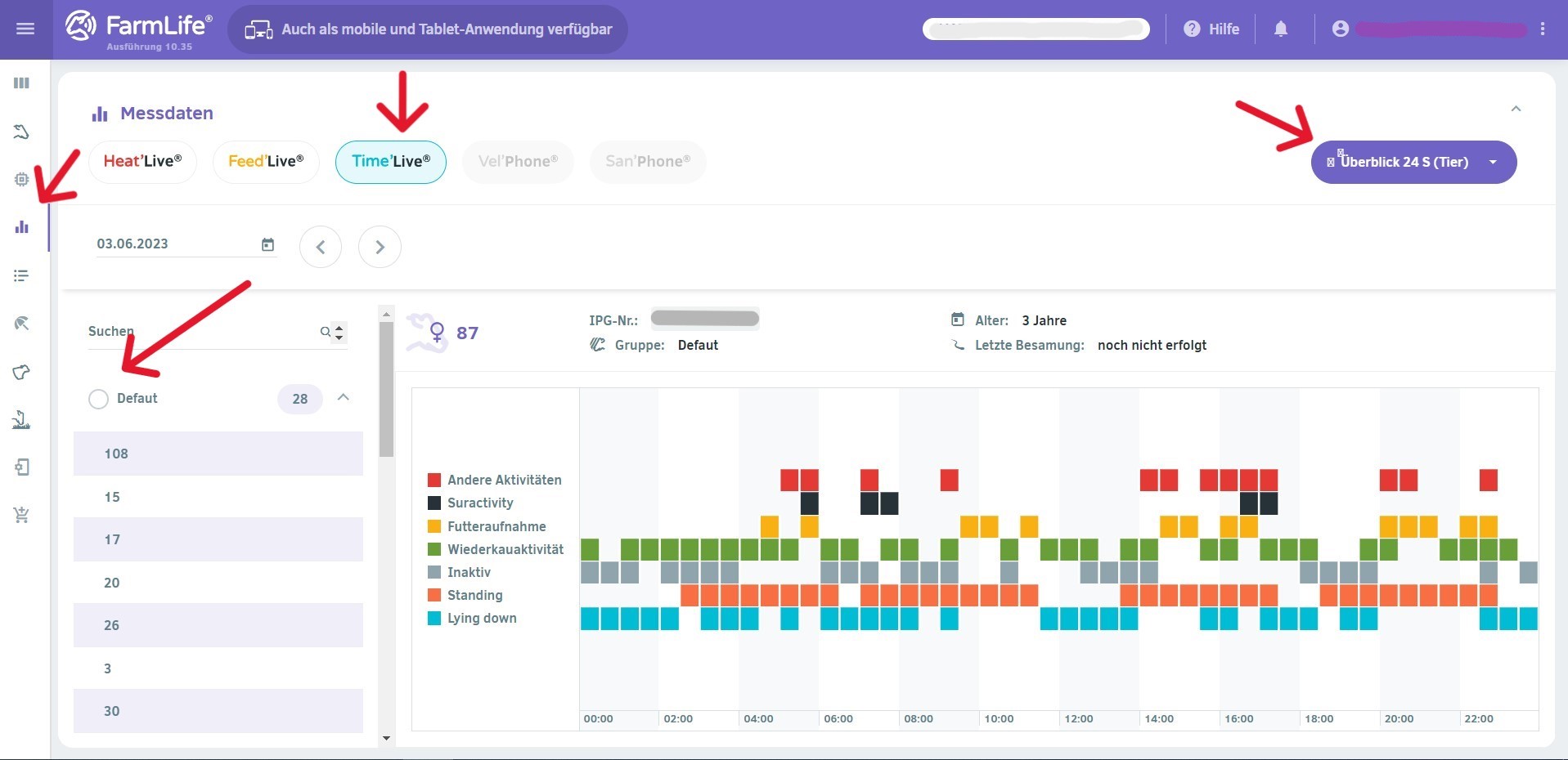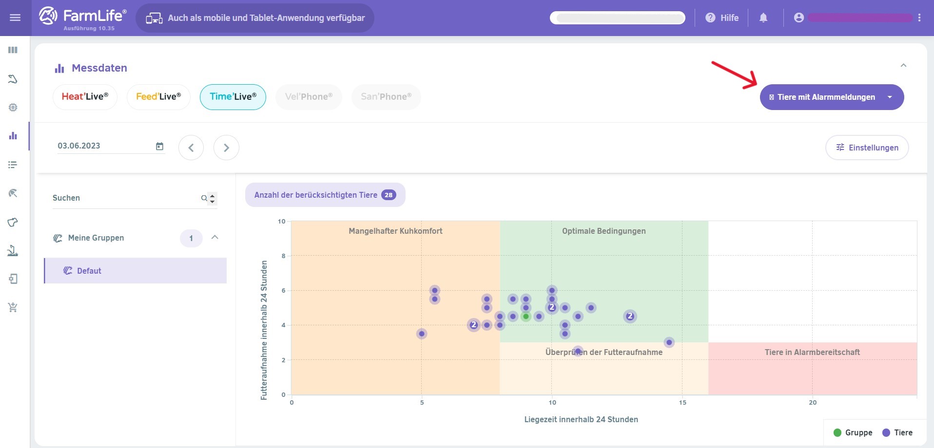 | Unter dem Menüpunkt "Messdaten-TimeLive" können verschiedene Grafiken zum Wohlbefinden und Tierverhalten der Herde oder auch jedes Einzeltiers abgerufen werden. Zwischen den Grafiken kann über das Dropdown in der oberen rechten Ecke gewählt werden. Auf der linken Seite lässt sich innerhalb der Tabelle abhängig von der gewählten Grafik zwischen Einzeltieren oder angelegten Gruppen unterscheiden. |