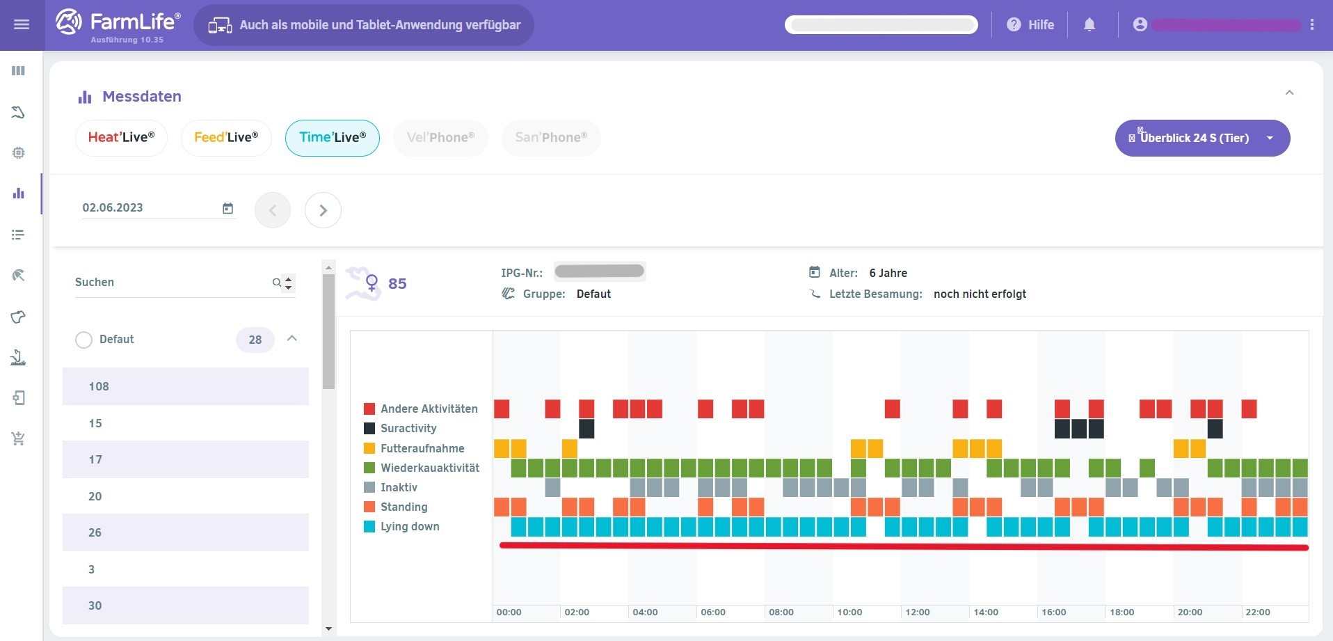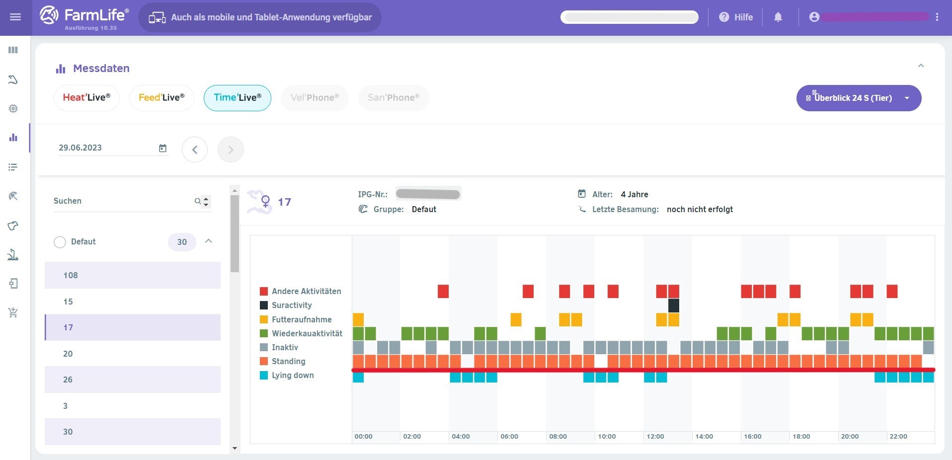 Die richtige Installation des Systems lässt sich im Tutorial des FarmWikis (https://farmwiki.de/de/Tutorials/medriaFarmLife) nachvollziehen. Ist die Installation abgeschlossen, muss das System etwa drei Wochen mit Daten angelernt werden, ehe Auswertungen zur Verfügung stehen. Die Auswertungen zum Tierverhalten lassen sich sowohl stündlich fürs Einzeltier als auch für die Gesamtherde einsehen.