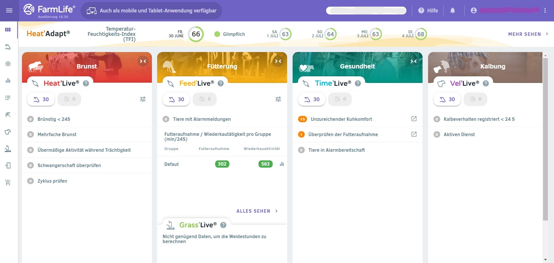 | Nach erfolgreicher Systeminstallation und ausreichender Datensammlung (etwa drei Wochen) können die Funktionen des FarmLife-Systems im vollen Umfang unter https://farmlife.fr/login abgerufen werden. Auf dem Dashboard wird unter der Kachel "Gesundheit-TimeLive" ein erster Überblick über die Gesundheitsdaten der Herde gegeben. Tiere mit einer Alarmmeldung werden hier bereits aufgeführt. |